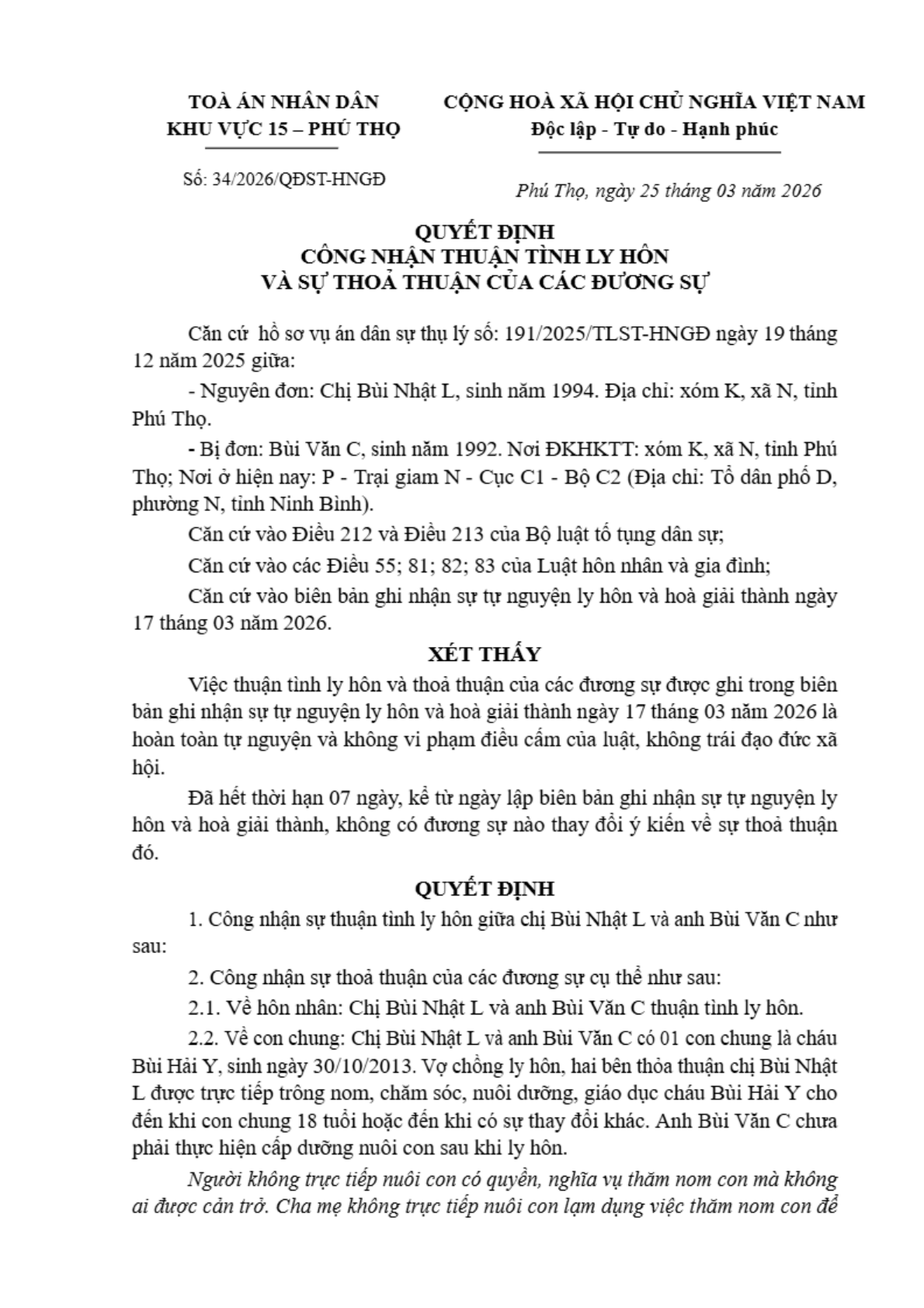 | Thông tin về vụ/việc: | Quyết định số 34/2026/QĐST-HNGĐ |