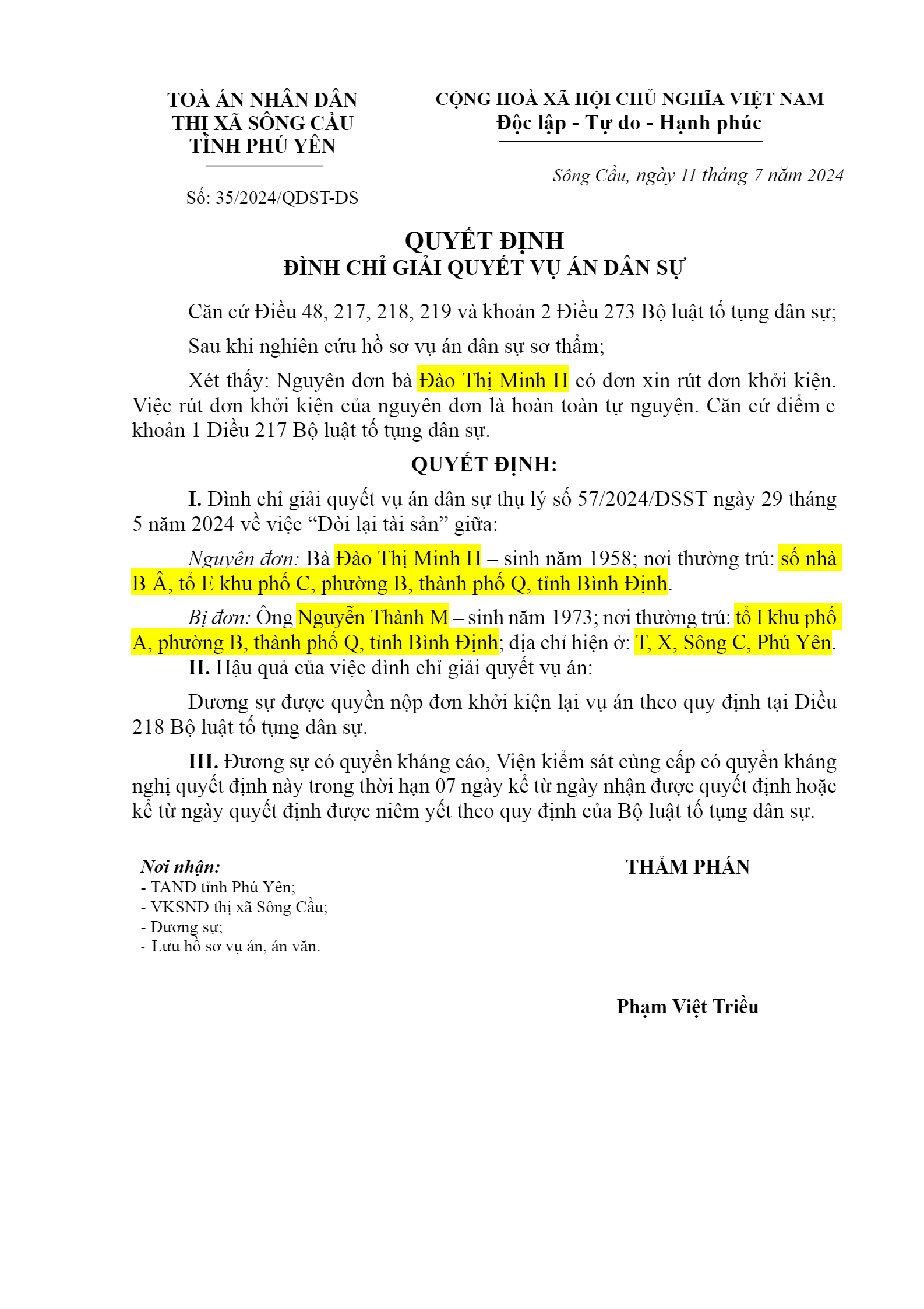 | Tòa án xét xử: | TAND TX. Sông Cầu (TAND tỉnh Phú Yên) |