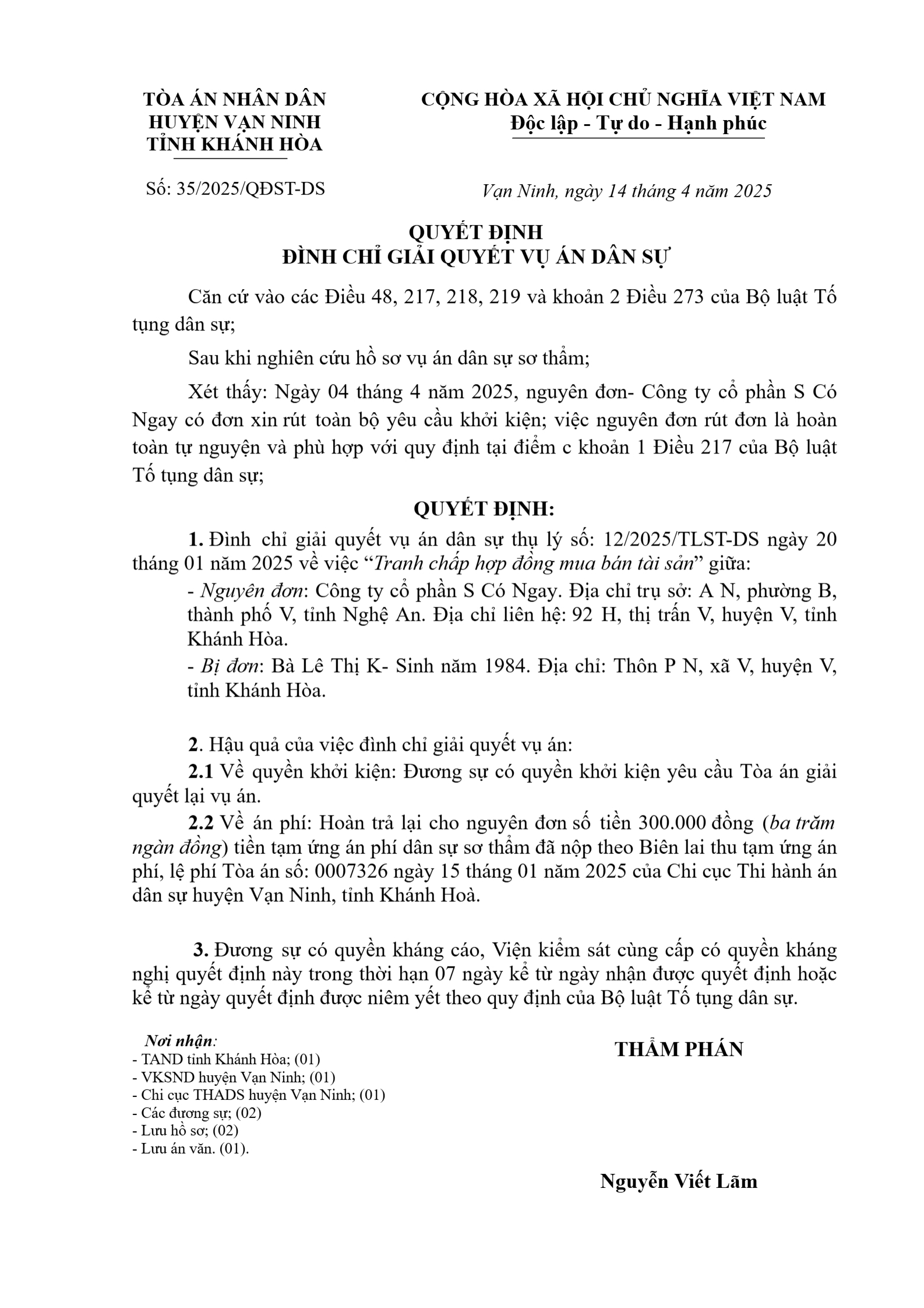 Quyết định số 35/2025/QĐST-DS ngày 14/04/2025 của TAND huyện Vạn Ninh, tỉnh Khánh Hòa về tranh chấp hợp đồng thuê tài sản
