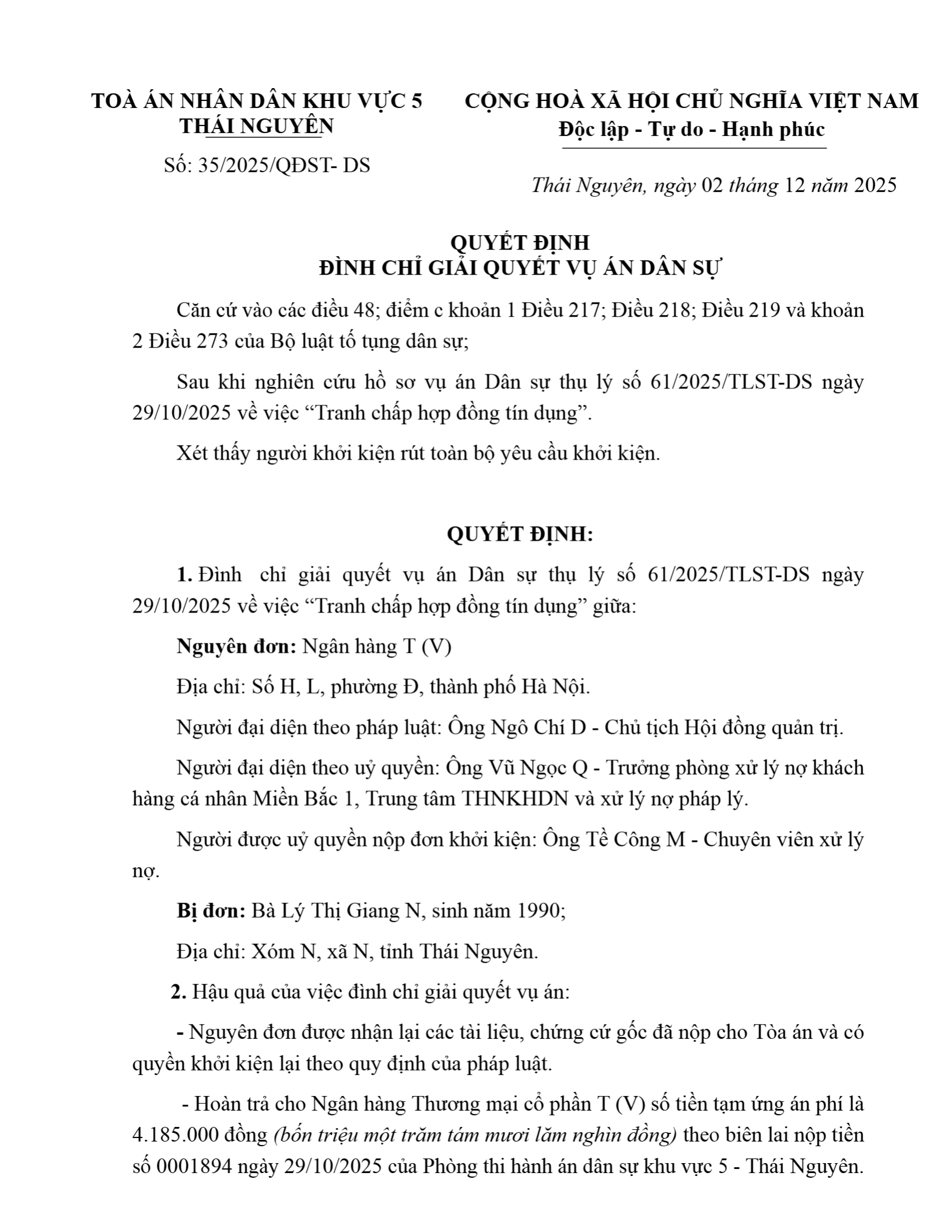 Quyết định số 35/2025/QĐST-DS ngày 02/12/2025 của Tòa án nhân dân khu vực 5 - Thái Nguyên, tỉnh Thái Nguyên về tranh chấp hợp đồng tín dụng