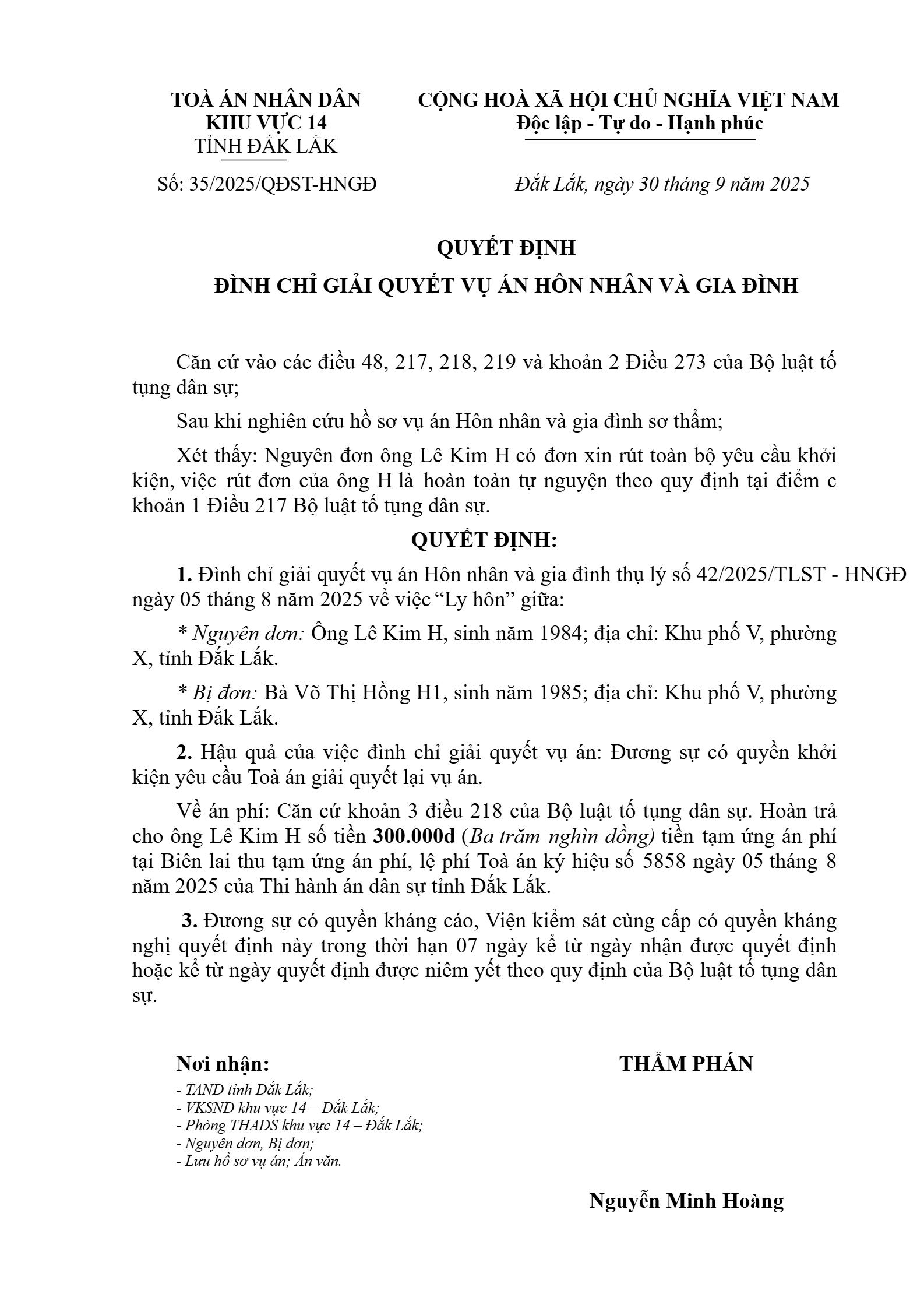 Quyết định số 35/2025/QĐST-HNGĐ ngày 30/09/2025 của Tòa án nhân dân khu vực 14 - Đắk Lắk, tỉnh Đắk Lắk về vụ án ly hôn về mâu thuẫn gia đình