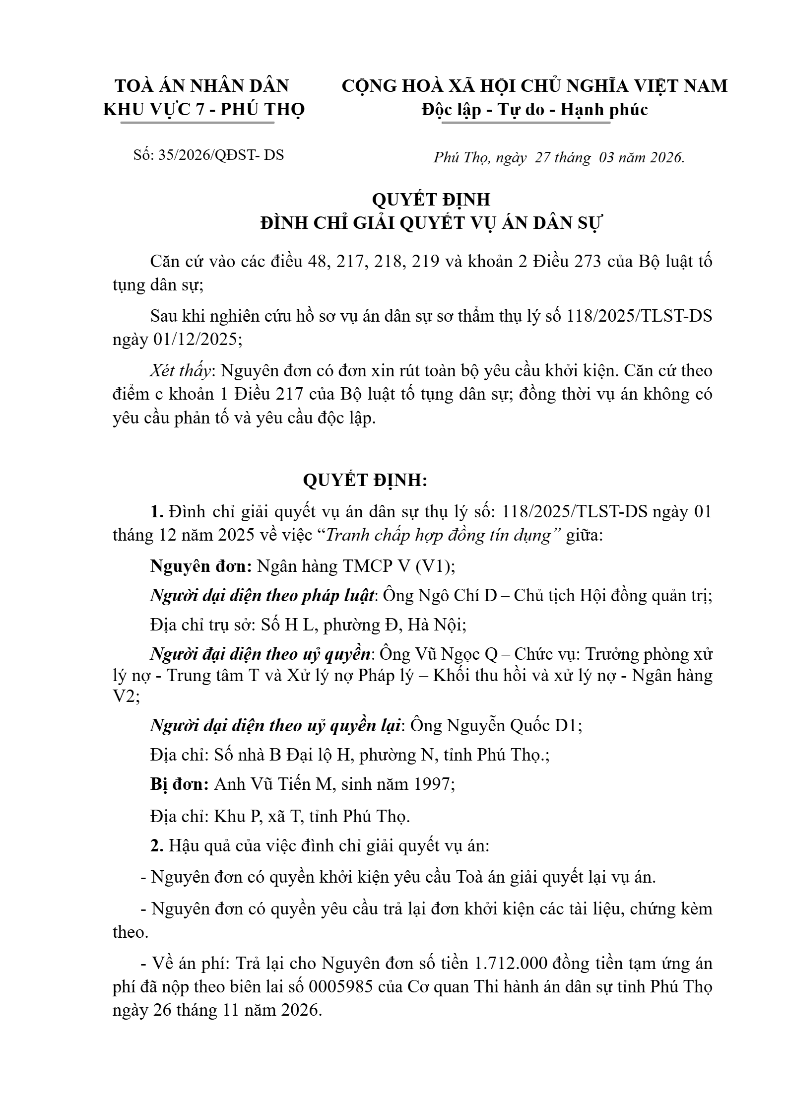 Quyết định số 35/2026/QĐST-DS ngày 27/03/2026 của Tòa án nhân dân khu vực 7 - Phú Thọ, tỉnh Phú Thọ về tranh chấp hợp đồng tín dụng