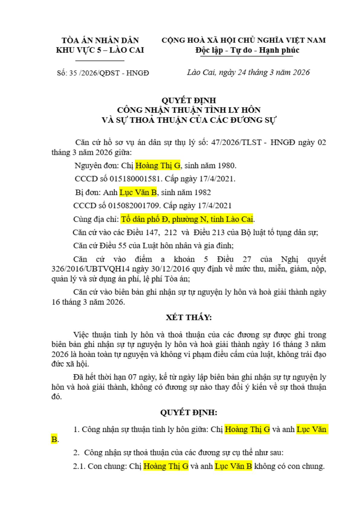 Quyết định số 35/2026/QĐST-HNGĐ ngày 24/03/2026 của Tòa án nhân dân khu vực 5 - Lào Cai, tỉnh Lào Cai về vụ án ly hôn về bệnh tật, không có con
