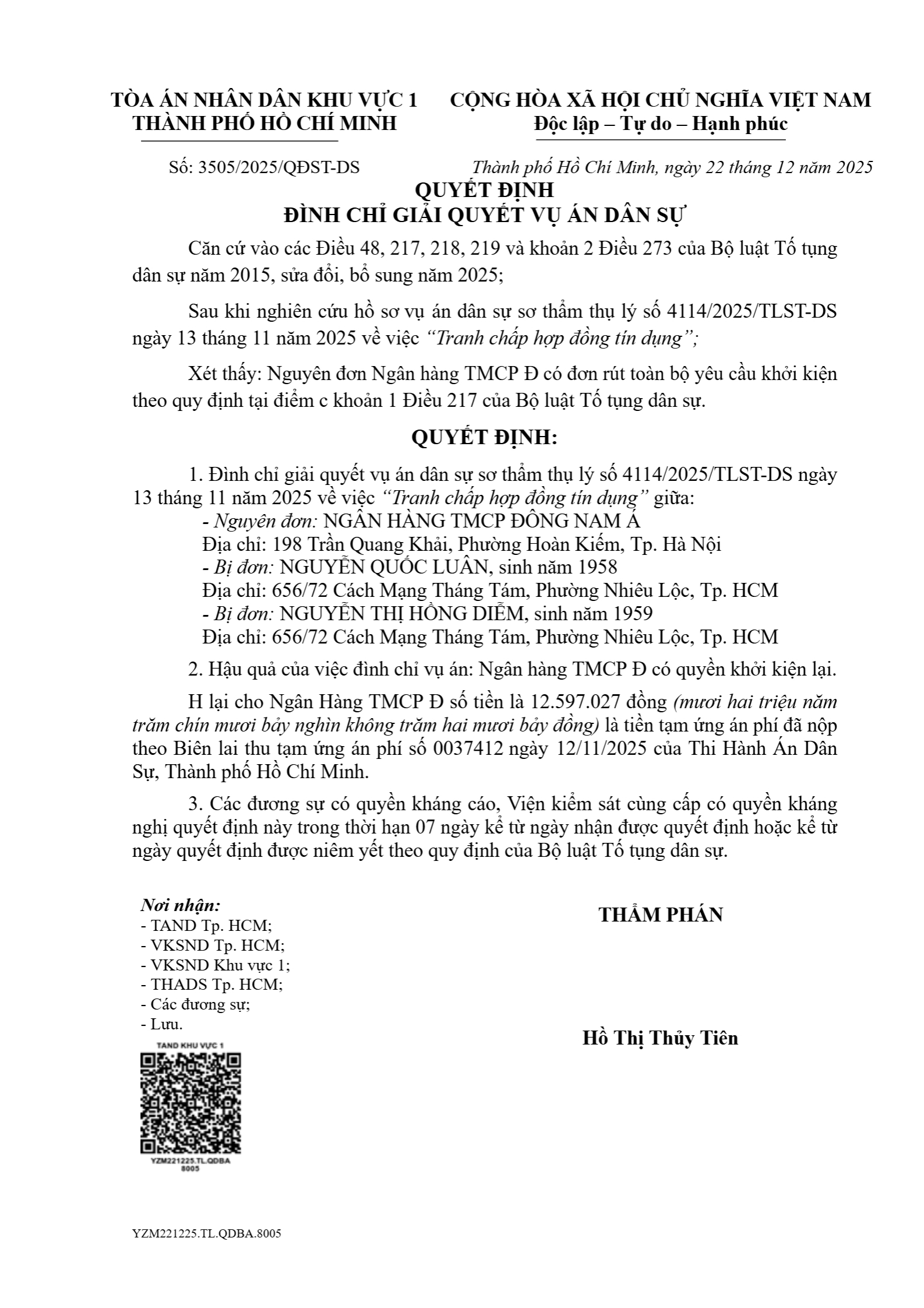 Quyết định số 3505/2025/QĐST-DS ngày 22/12/2025 của Tòa án nhân dân khu vực 1 - Hồ Chí Minh, TP. Hồ Chí Minh về tranh chấp hợp đồng tín dụng
