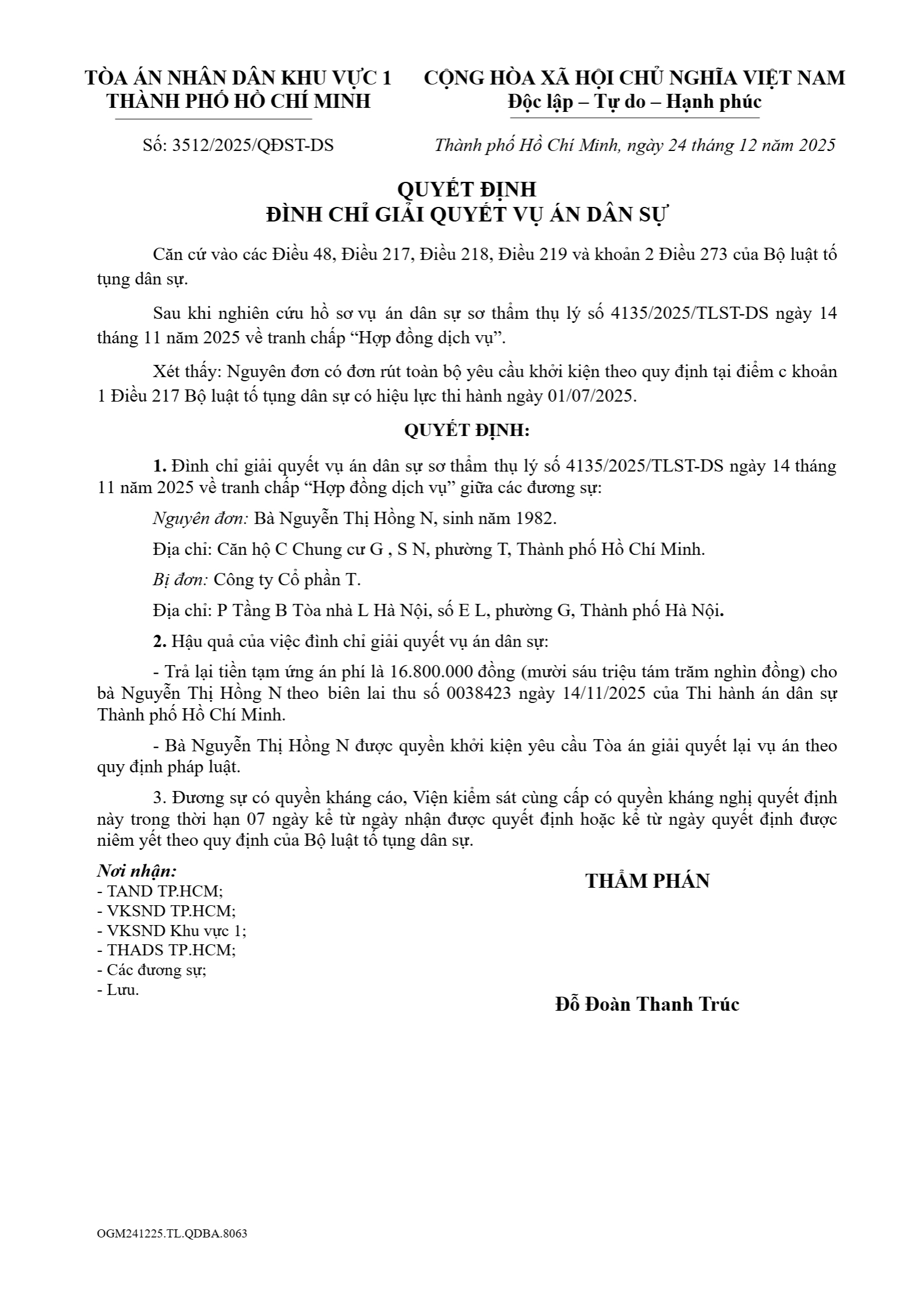 Quyết định số 3512/2025/QĐST-DS ngày 24/12/2025 của Tòa án nhân dân khu vực 1 - Hồ Chí Minh, TP. Hồ Chí Minh về tranh chấp hợp đồng dịch vụ