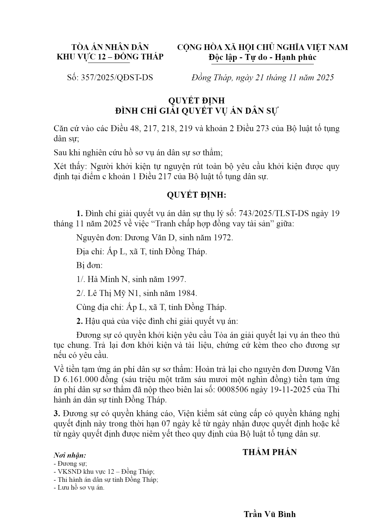 Quyết định số 357/2025/QĐST-DS ngày 21/11/2025 của Tòa án nhân dân khu vực 12 - Đồng Tháp, tỉnh Đồng Tháp về tranh chấp hợp đồng vay tài sản