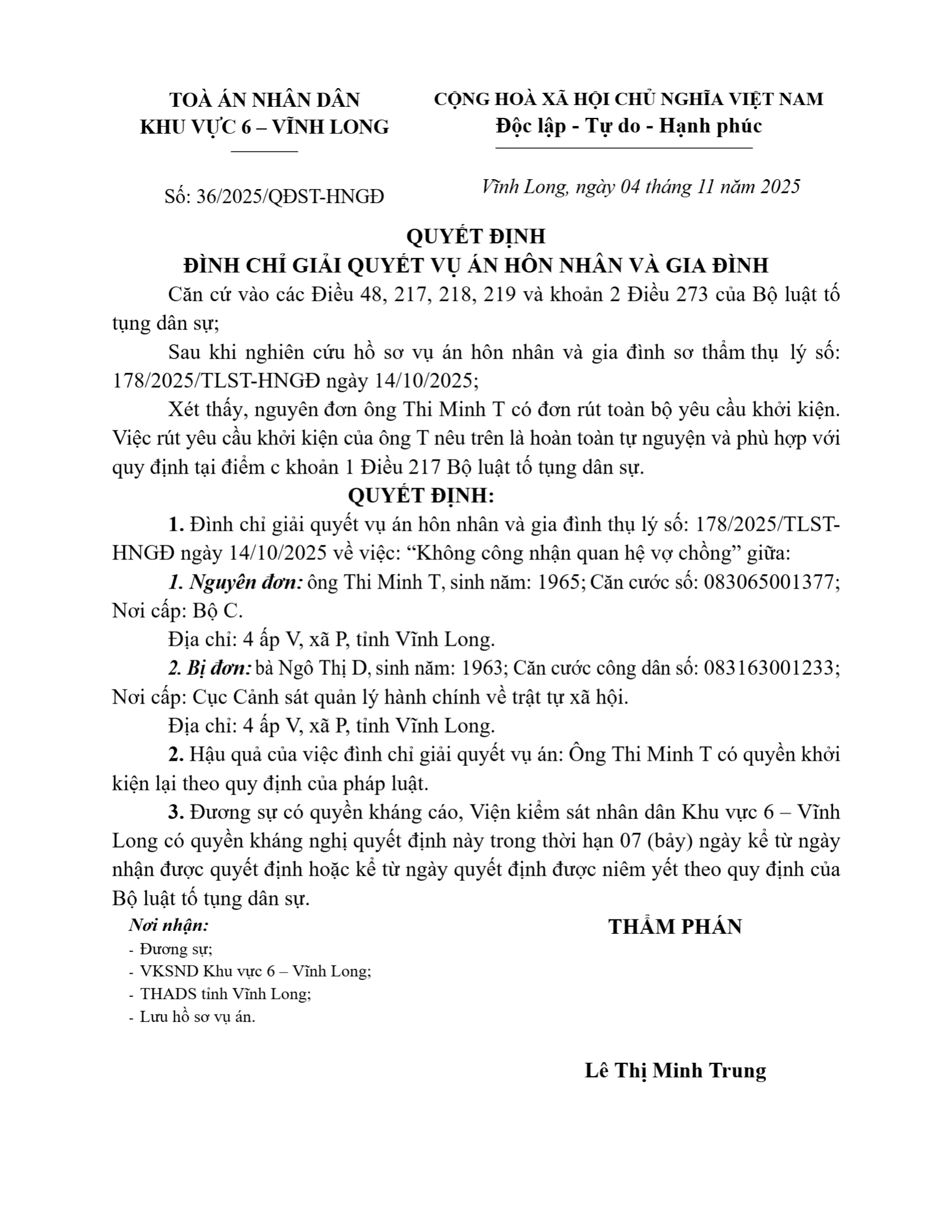 Quyết định số 36/2025/QĐST-HNGĐ ngày 04/11/2025 của Tòa án nhân dân khu vực 6 - Vĩnh Long, tỉnh Vĩnh Long về vụ án ly hôn về mâu thuẫn gia đình