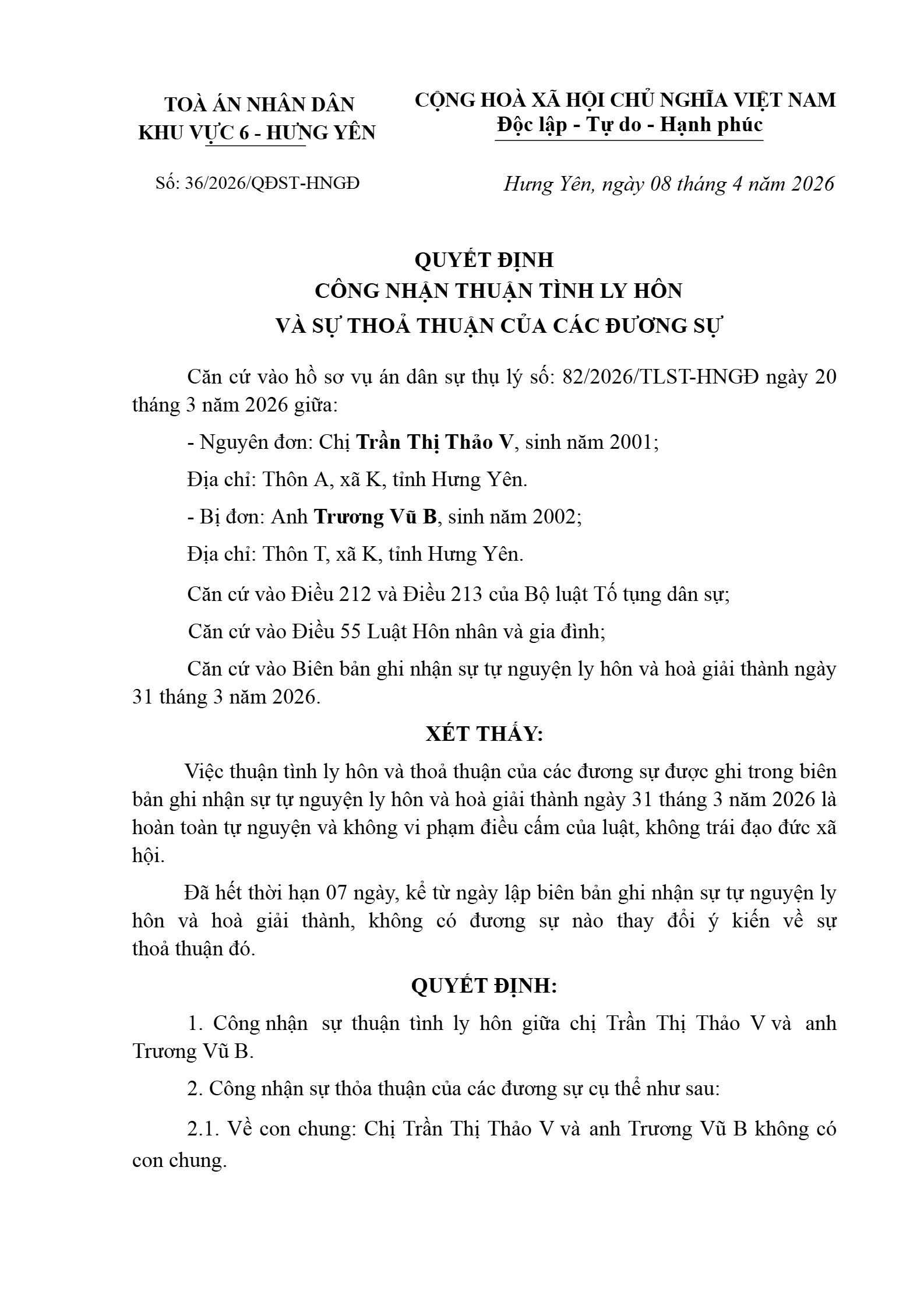Quyết định số 36/2026/QĐST-HNGĐ ngày 08/04/2026 của Tòa án nhân dân khu vực 6 - Hưng Yên, tỉnh Hưng Yên về vụ án ly hôn về mâu thuẫn gia đình