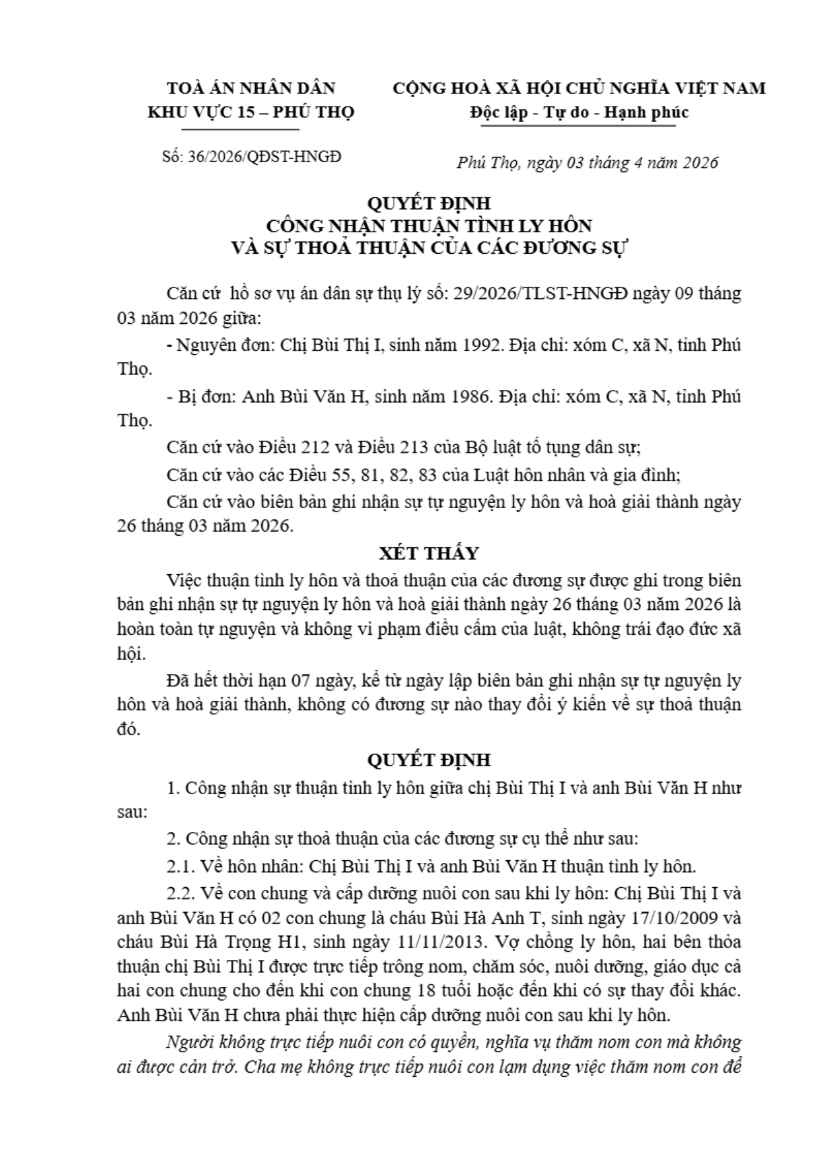 | Thông tin về vụ/việc: | Số Quyết định 36/2026/QĐST-HNGĐ |