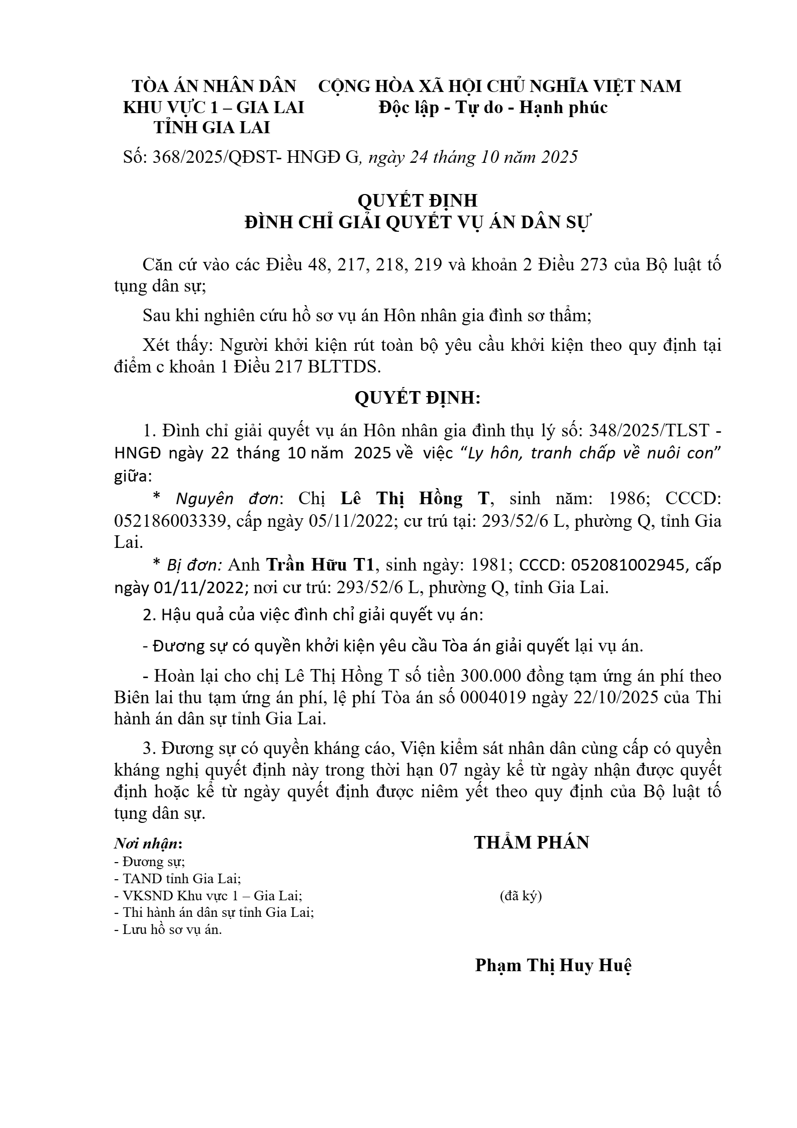 Quyết định số 368/2025/QĐST- ngày 24/10/2025 của Tòa án nhân dân khu vực 1 - Gia Lai, tỉnh Gia Lai về vụ án ly hôn về mâu thuẫn gia đình