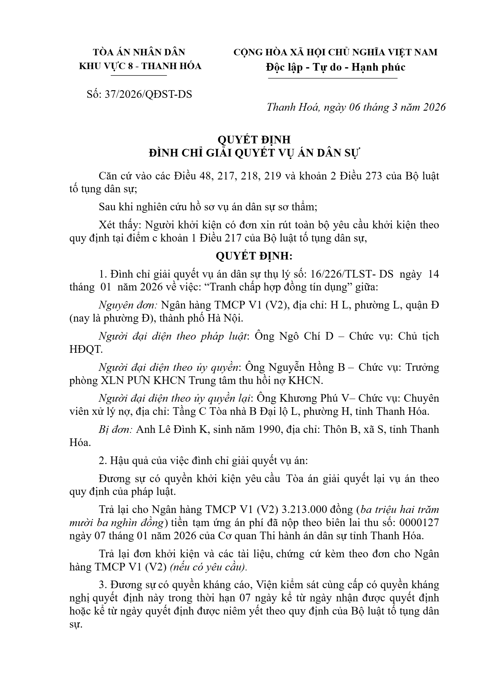 Quyết định số 37/2026/QĐST-DS ngày 06/03/2026 của Tòa án nhân dân khu vực 8 - Thanh Hóa, tỉnh Thanh Hóa về tranh chấp hợp đồng tín dụng