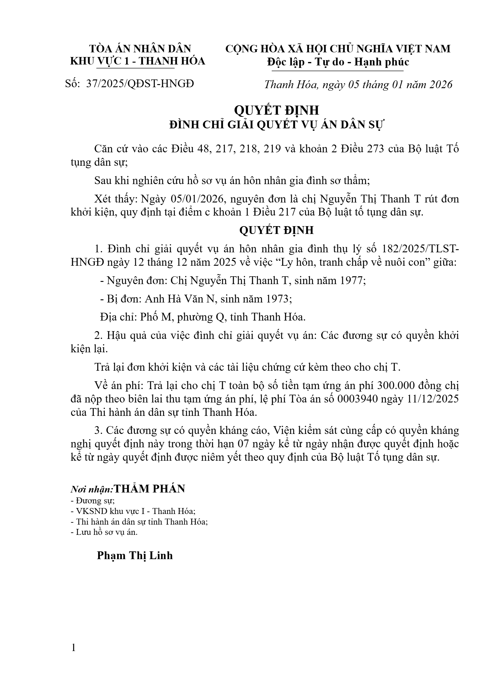 Quyết định số 37/2026/QĐST-HNGĐ ngày 05/01/2026 của Tòa án nhân dân khu vực 1 - Thanh Hóa, tỉnh Thanh Hóa về vụ án ly hôn về mâu thuẫn gia đình