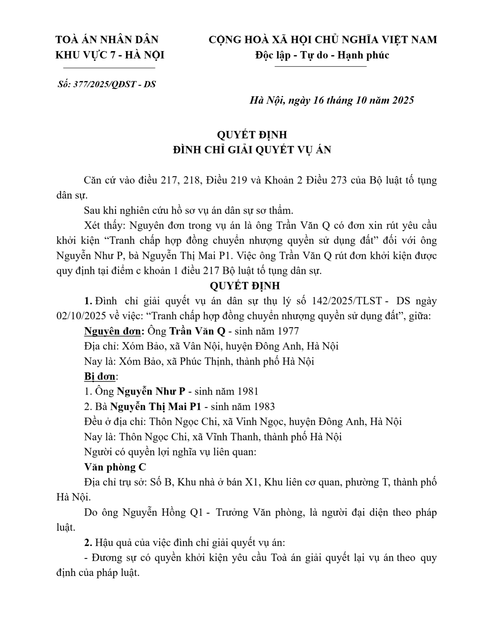 | Số hiệu: | 377/2025/QĐST-DS |