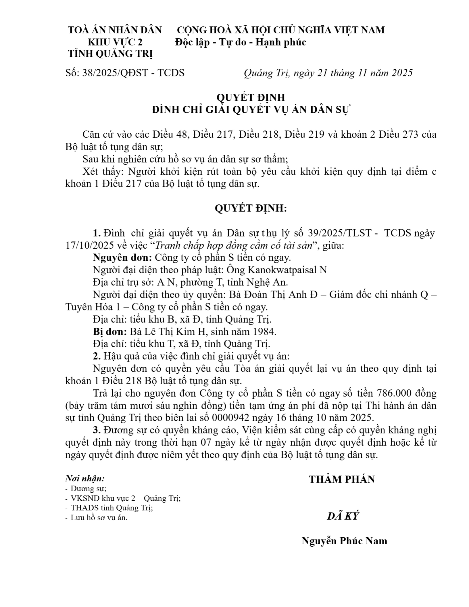 Quyết định số 38/2025/QĐST-DS ngày 18/11/2025 của Tòa án nhân dân khu vực 2 - Quảng Trị, tỉnh Quảng Trị về tranh chấp về quyền sở hữu và các quyền khác đối với tài sản