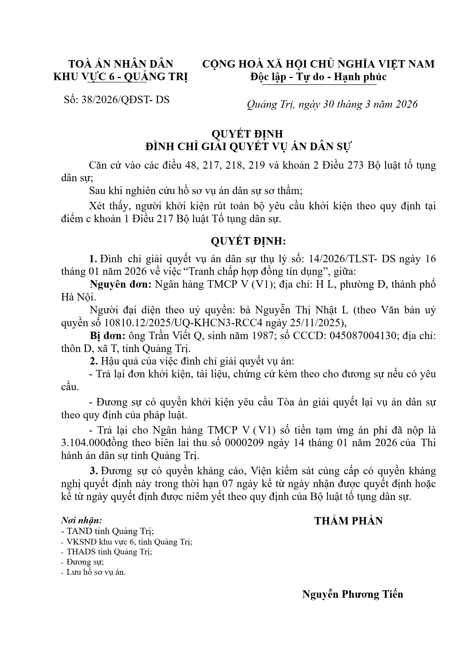 Quyết định số 38/2026/QĐST-DS ngày 30/03/2026 của Tòa án nhân dân khu vực 6 - Quảng Trị, tỉnh Quảng Trị về tranh chấp hợp đồng tín dụng
