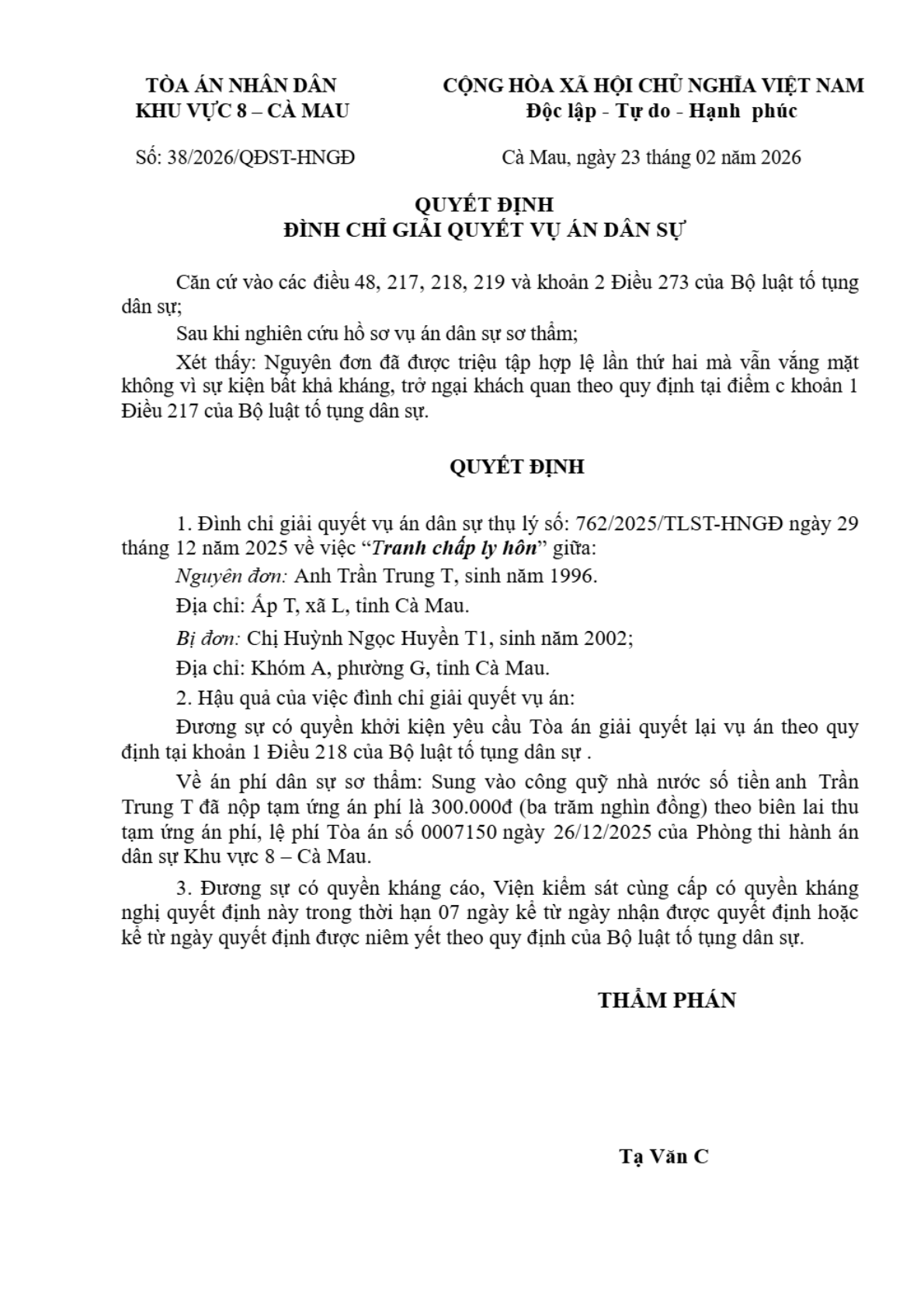 Quyết định số 38/2026/QĐST-HNGĐ ngày 23/02/2026 của Tòa án nhân dân khu vực 8 - Cà Mau, tỉnh Cà Mau về vụ án ly hôn về mâu thuẫn gia đình