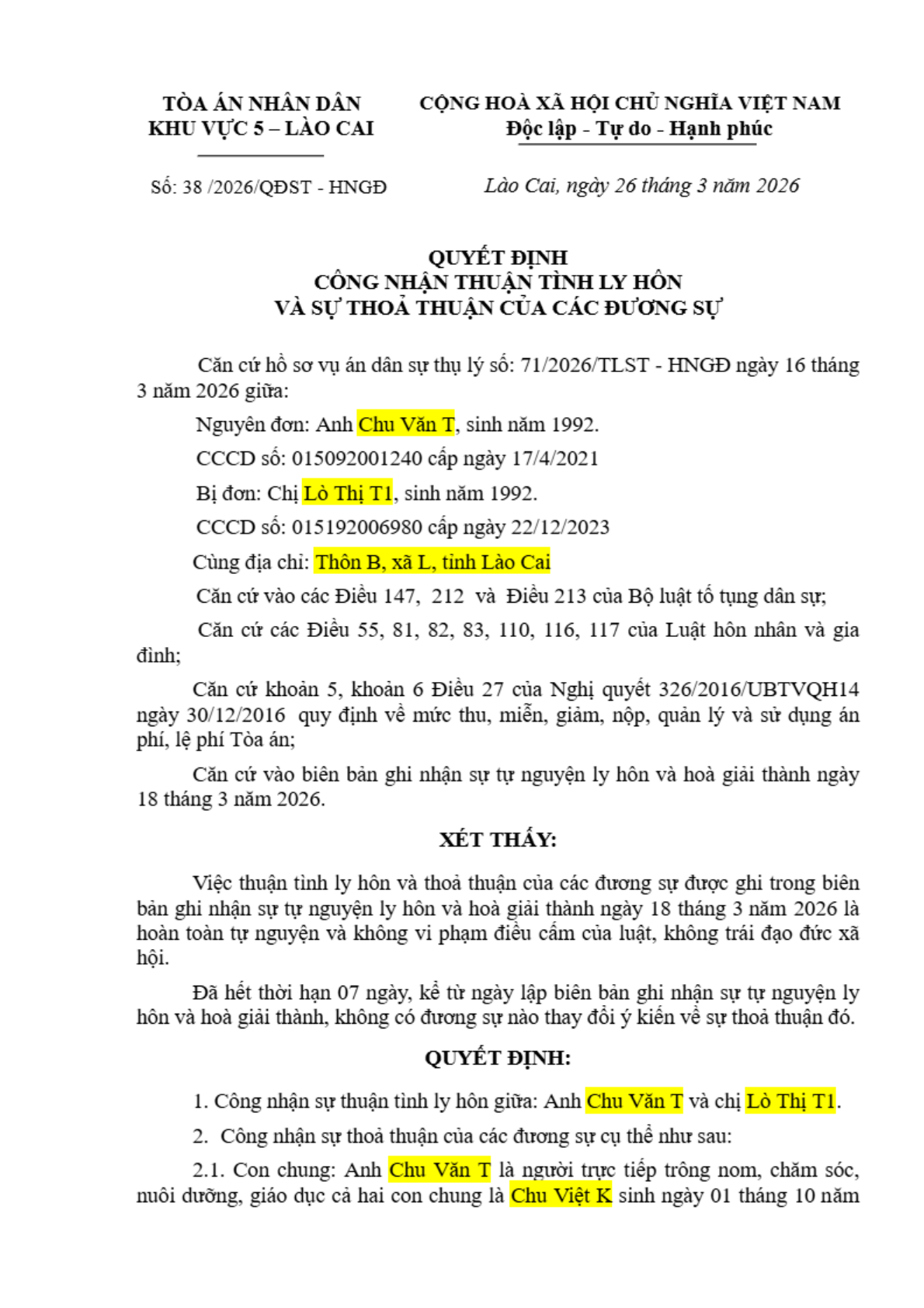 Quyết định số 38/2026/QĐST-HNGĐ ngày 26/03/2026 của Tòa án nhân dân khu vực 5 - Lào Cai, tỉnh Lào Cai về vụ án ly hôn về mâu thuẫn gia đình