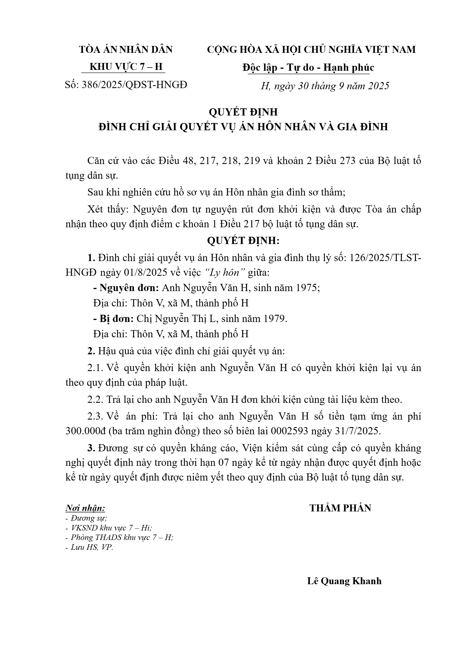 | Thông tin về vụ/việc: | Anh Nguyễn Văn H rút đơn khởi kiện |