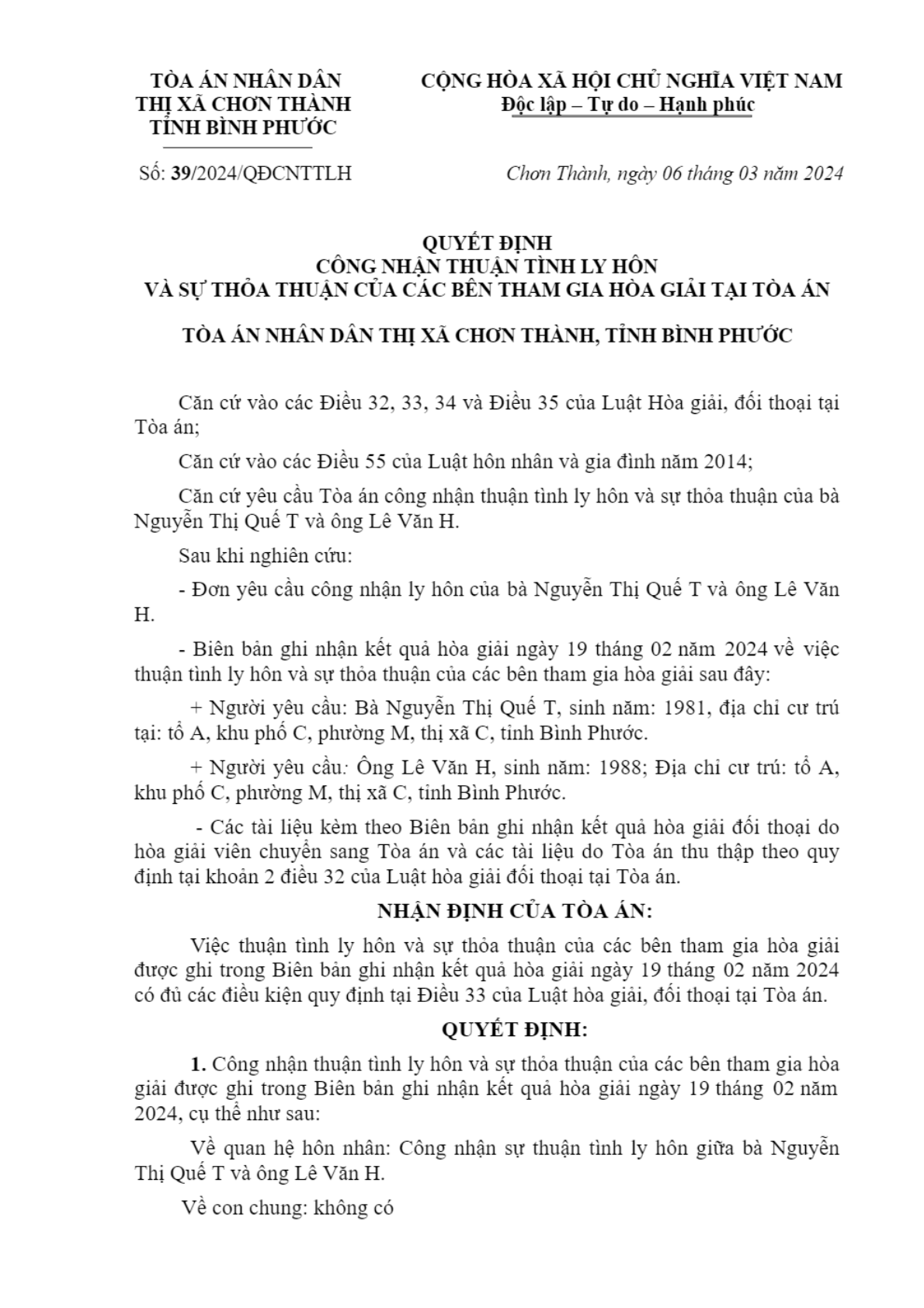 Quyết định số 39/2024/QĐCNTTLH ngày 06/03/2024 của TAND huyện Chơn Thành, tỉnh Bình Phước về vụ án ly hôn về mâu thuẫn gia đình