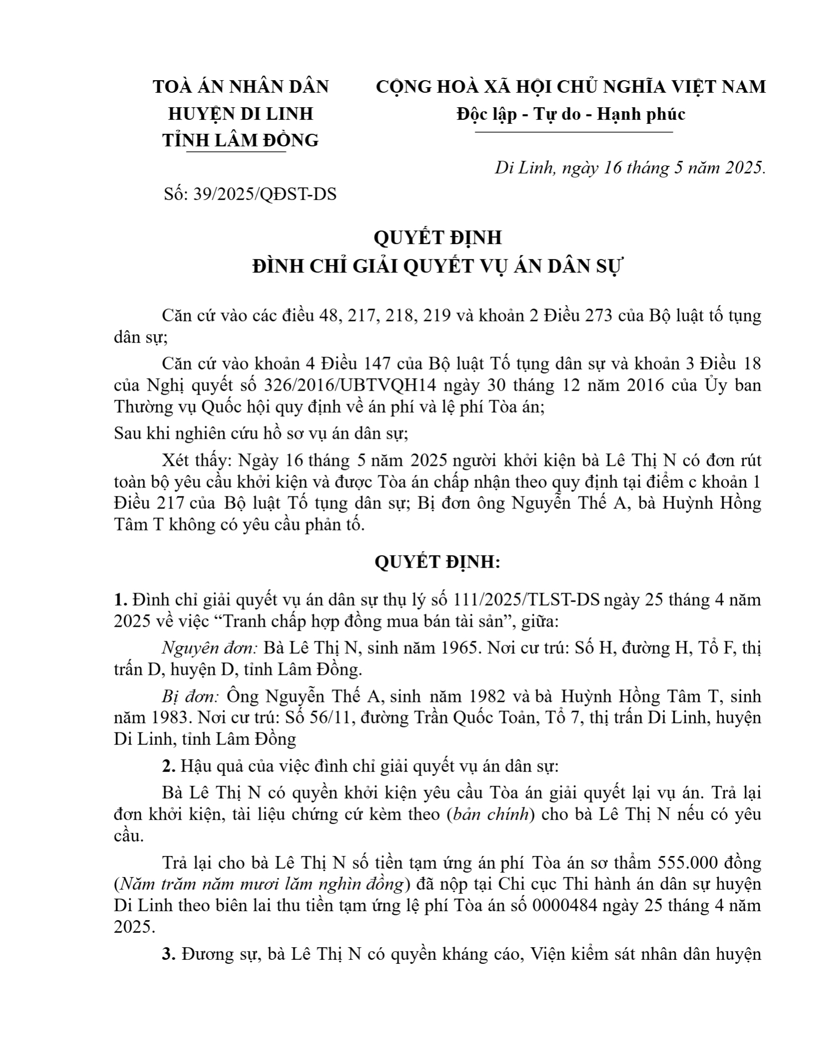 | Tên Quyết định: | Quyết định số 39/2025/QĐST-DS ngày 16/05/2025 của TAND huyện Di Linh, tỉnh Lâm Đồng về tranh chấp hợp đồng vay tài sản |