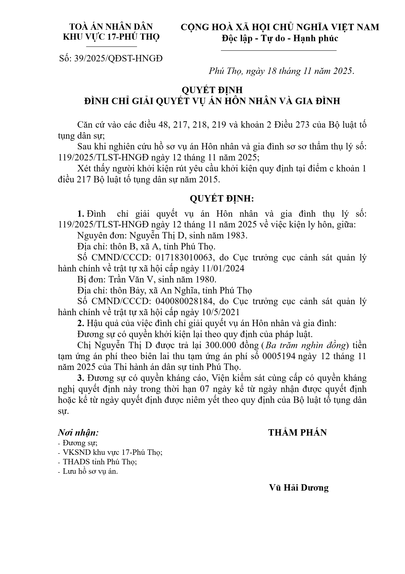 Quyết định số 39/2025/QĐST-HNGĐ ngày 18/11/2025 của Tòa án nhân dân khu vực 17 - Phú Thọ, tỉnh Phú Thọ về vụ án ly hôn về mâu thuẫn gia đình