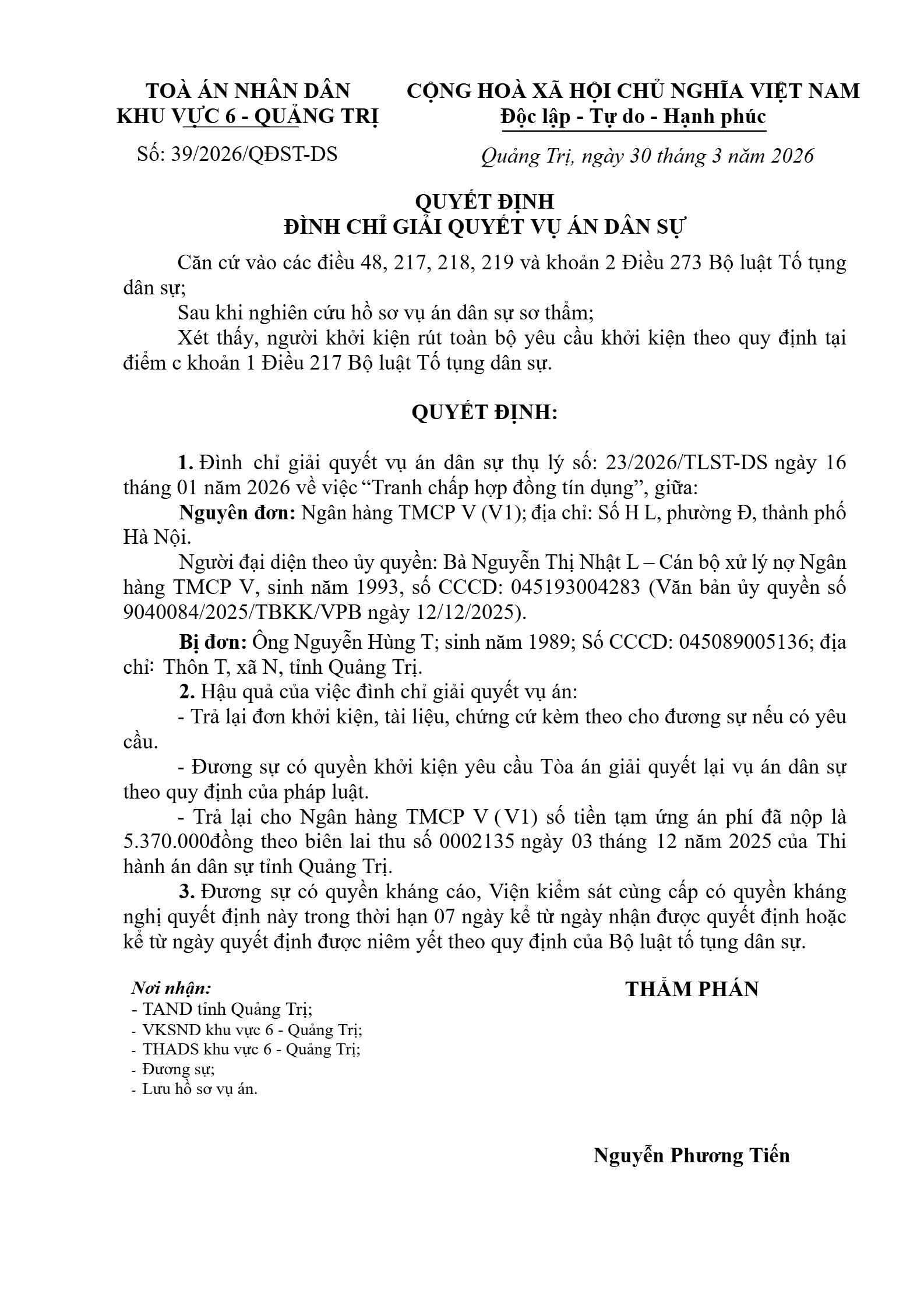 Quyết định số 39/2026/QĐST-DS ngày 30/03/2026 của Tòa án nhân dân khu vực 6 - Quảng Trị, tỉnh Quảng Trị về tranh chấp hợp đồng tín dụng