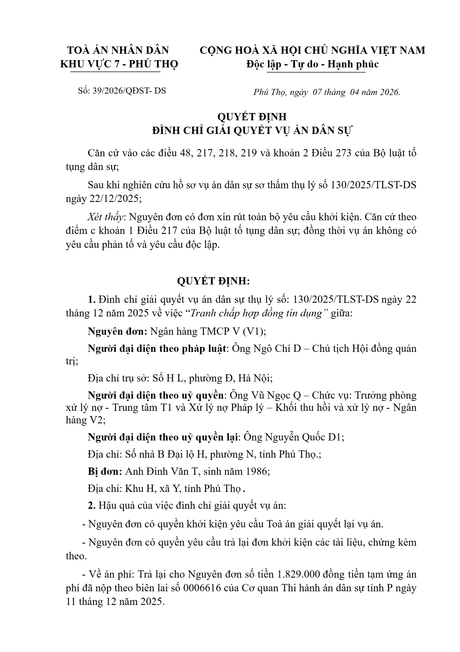 Quyết định số 39/2026/QĐST-DS ngày 07/04/2026 của Tòa án nhân dân khu vực 7 - Phú Thọ, tỉnh Phú Thọ về tranh chấp hợp đồng tín dụng