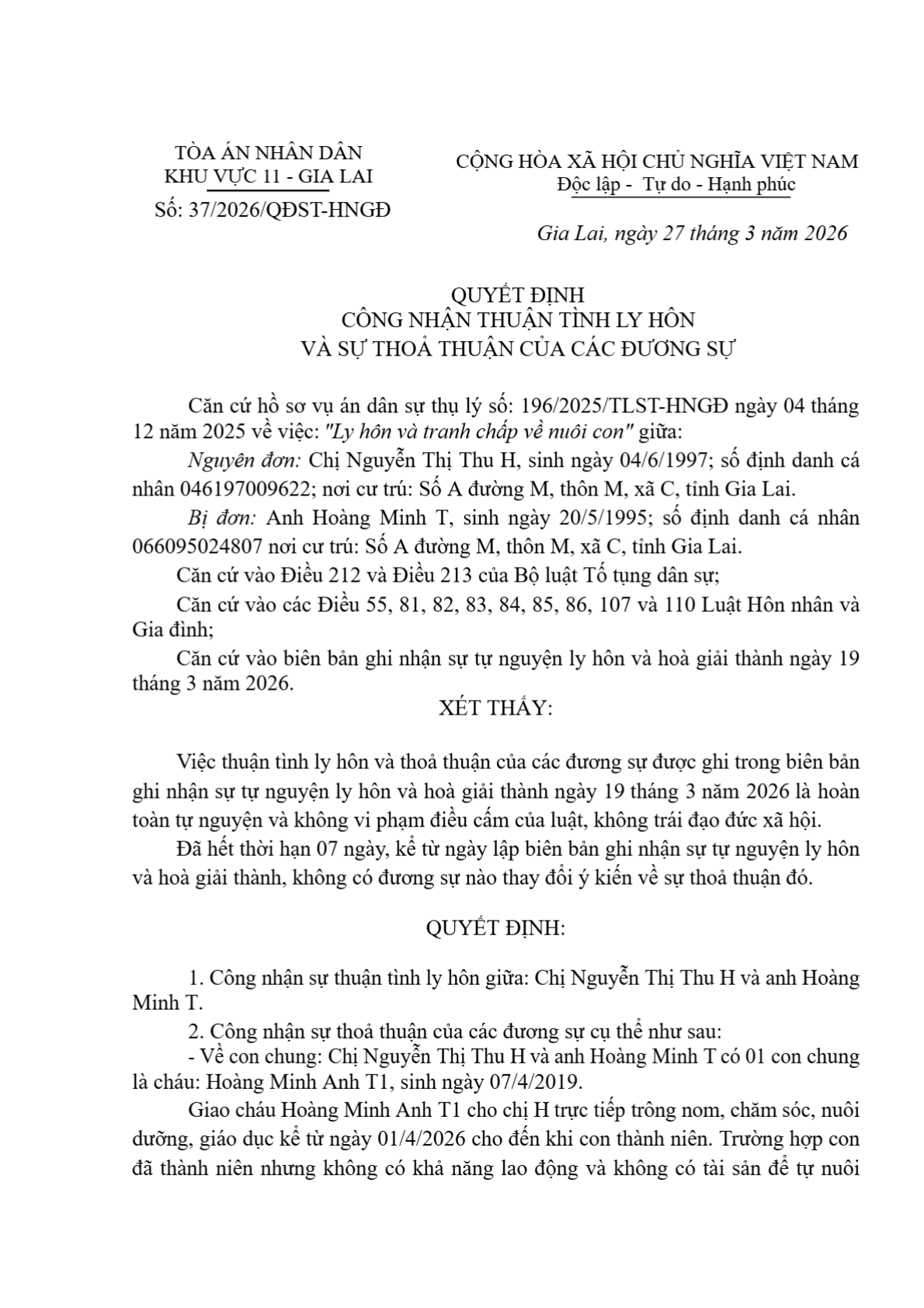 Quyết định số 39/2026/QĐST-HNGĐ ngày 27/03/2026 của Tòa án nhân dân khu vực 11 - Gia Lai, tỉnh Gia Lai về vụ án ly hôn về mâu thuẫn gia đình