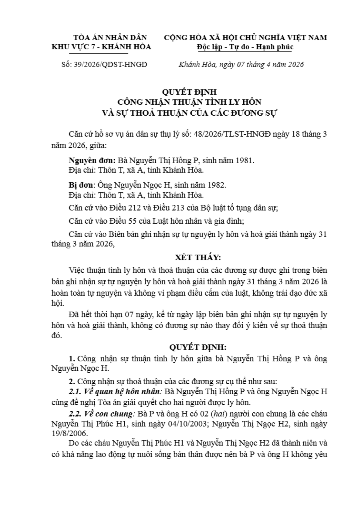 Quyết định số 39/2026/QĐST-HNGĐ ngày 07/04/2026 của Tòa án nhân dân khu vực 7 - Khánh Hòa, tỉnh Khánh Hòa về vụ án ly hôn về mâu thuẫn gia đình