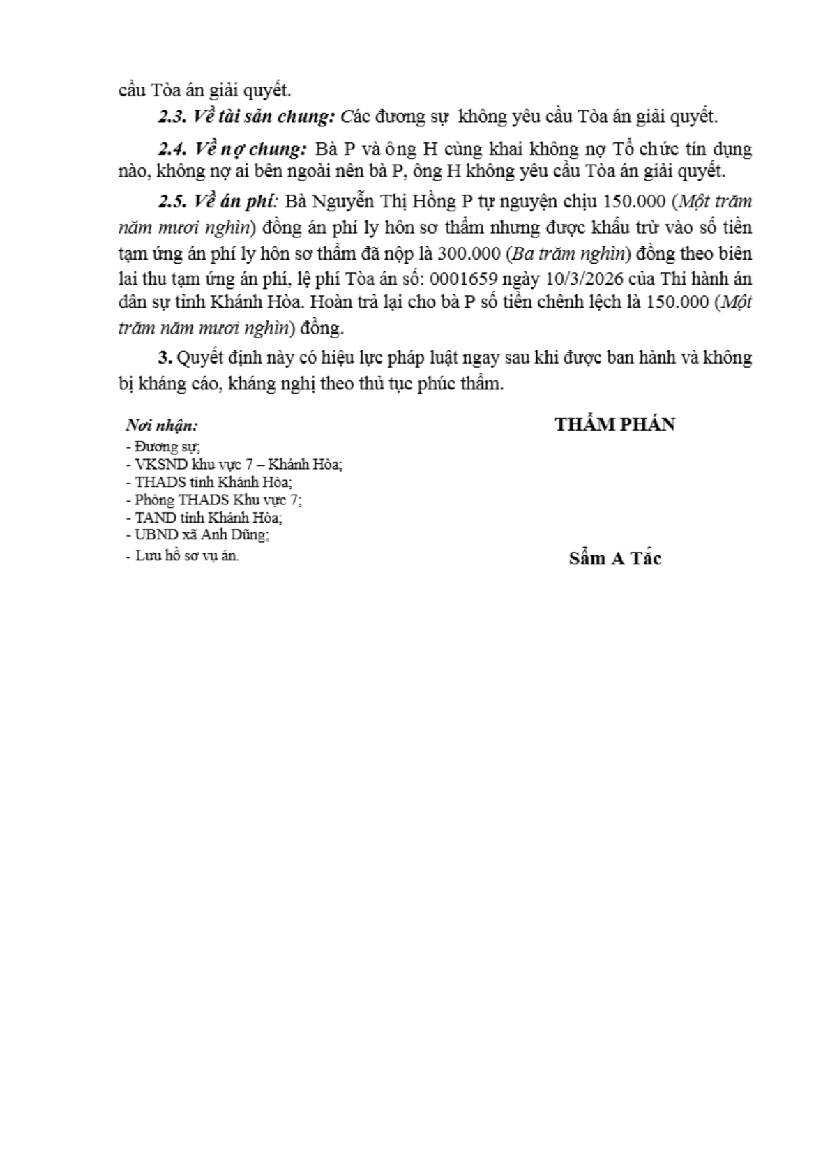 | Thông tin về vụ/việc: | Quyết định công nhận thuận tình ly hôn và sự thỏa thuận của các đương sự |