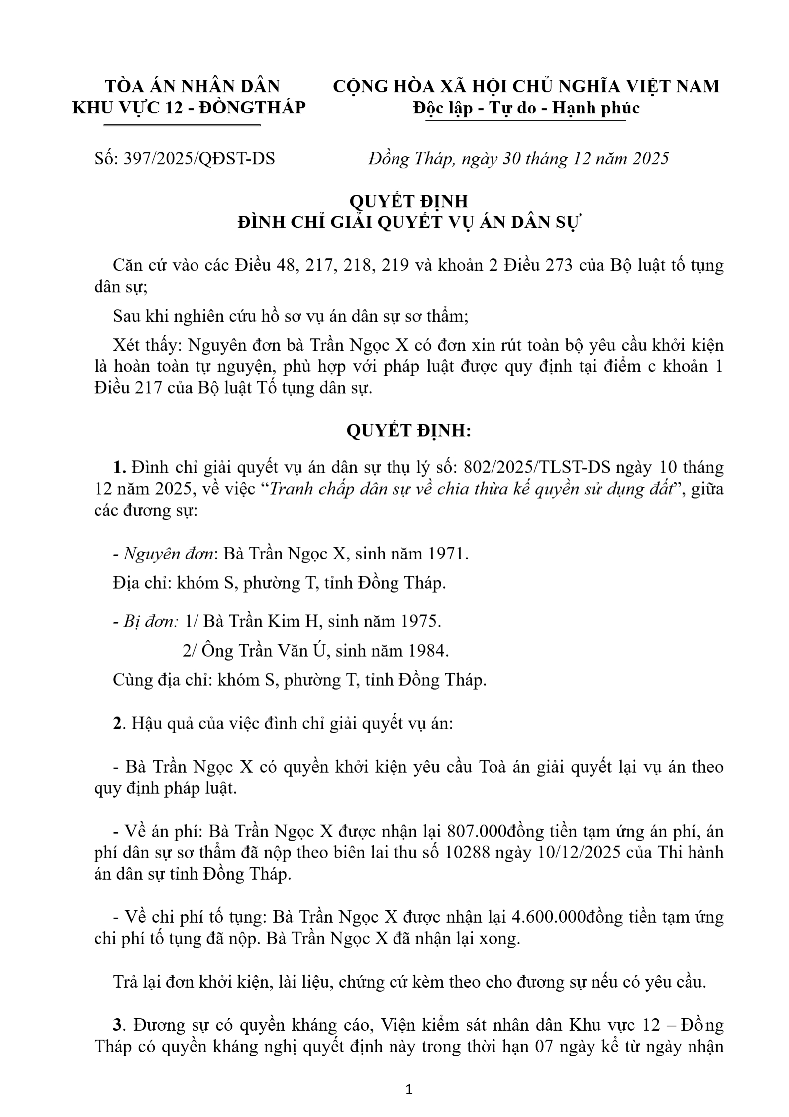 | Tên Quyết định: | Quyết định số 397/2025/QĐST-DS ngày 30/12/2025 của Tòa án nhân dân khu vực 12 - Đồng Tháp, tỉnh Đồng Tháp về tranh chấp thừa kế quyền sử dụng đất |