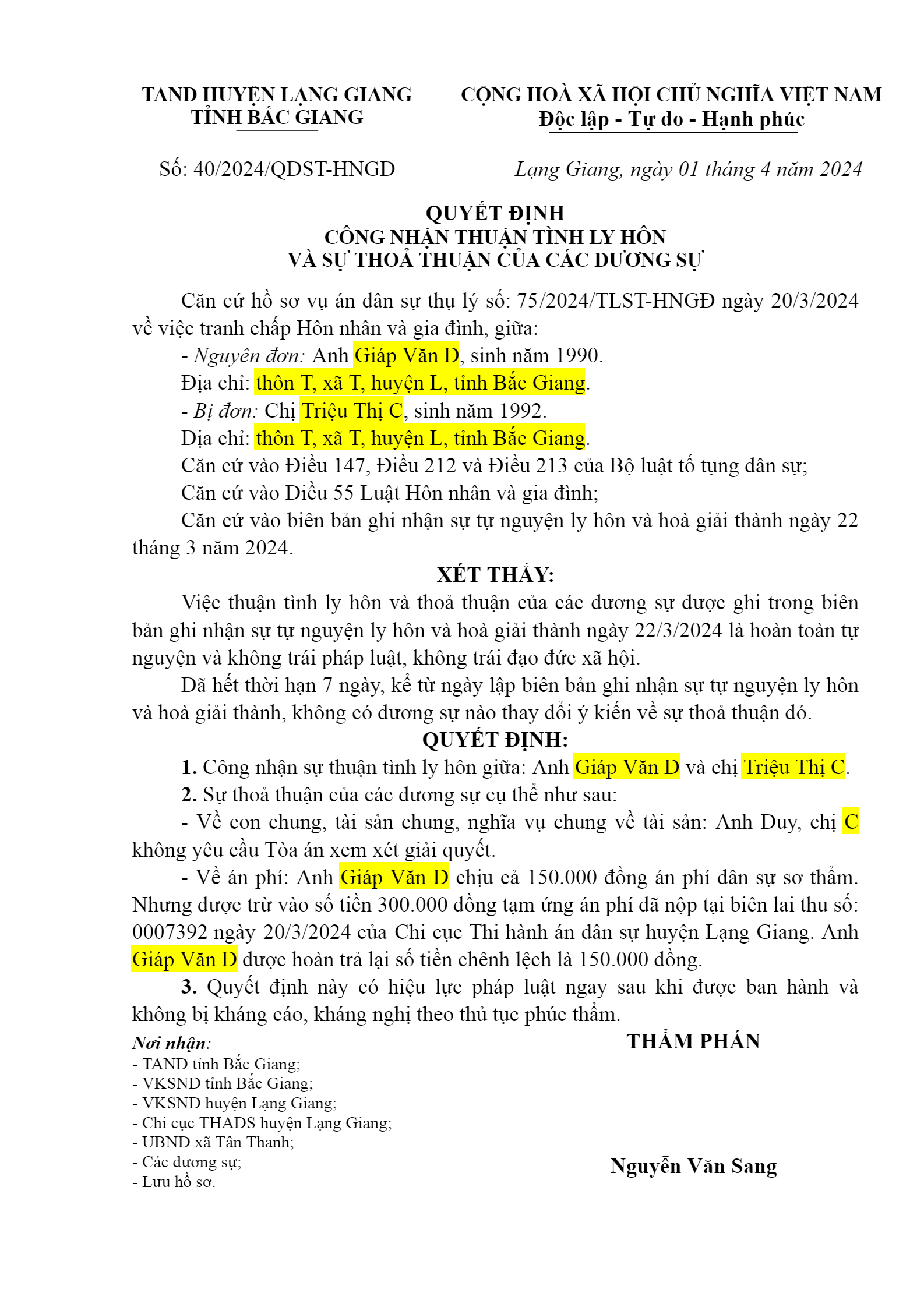 Quyết định số 40/2024/QĐST-HNGĐ ngày 01/04/2024 của TAND huyện Lạng Giang, tỉnh Bắc Giang về vụ án ly hôn về mâu thuẫn gia đình