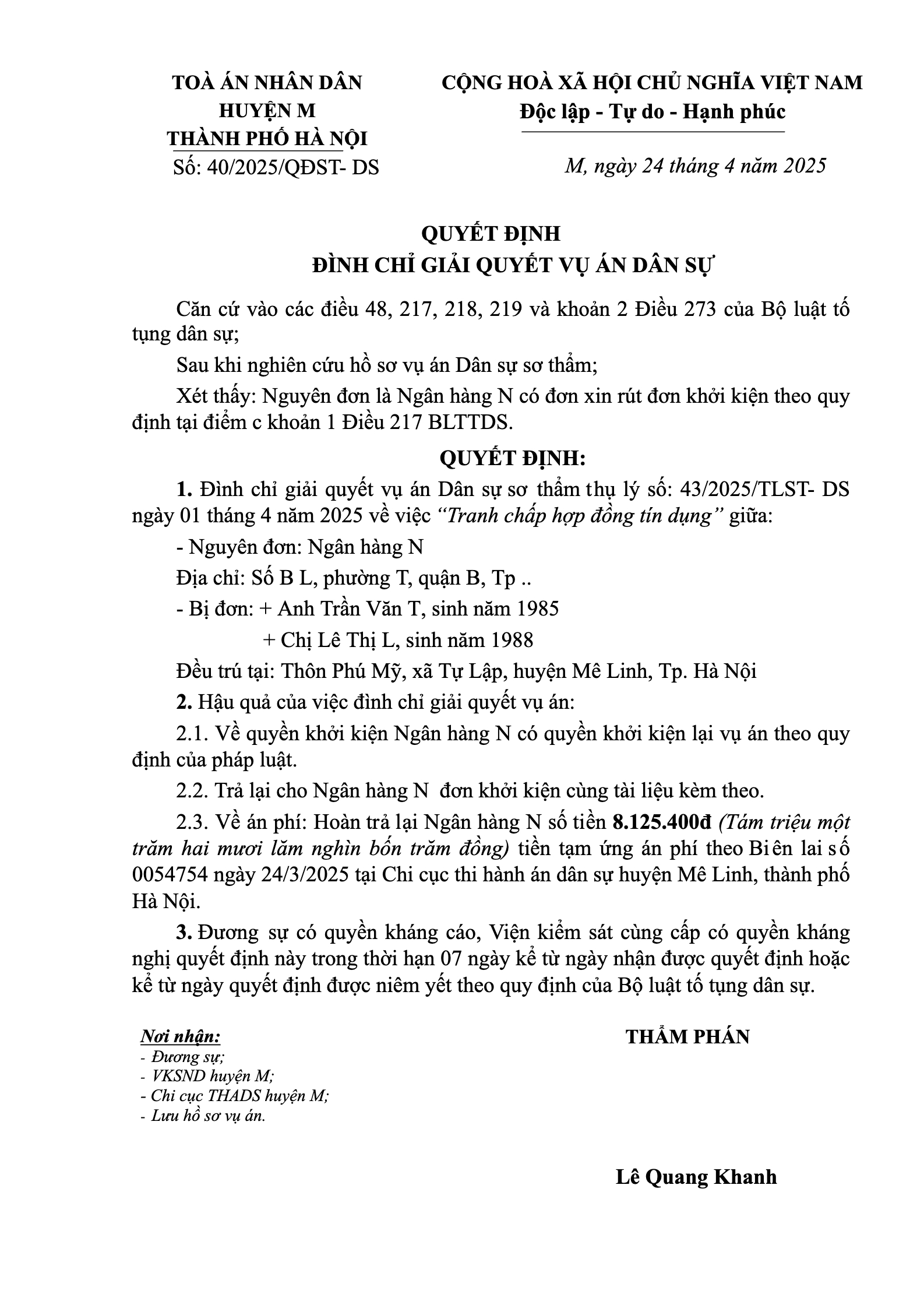 Quyết định số 40/2025/QĐST-DS ngày 24/04/2025 của Tòa án nhân dân khu vực 7 - Hà Nội, TP. Hà Nội về tranh chấp hợp đồng tín dụng
