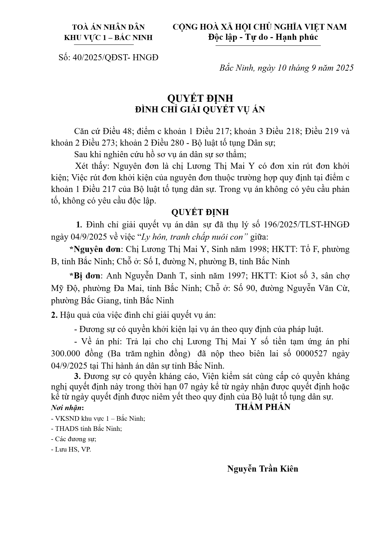 Quyết định số 40/2025/QĐST-HNGĐ ngày 10/09/2025 của Tòa án nhân dân khu vực 1 - Bắc Ninh, tỉnh Bắc Ninh về vụ án ly hôn về mâu thuẫn gia đình
