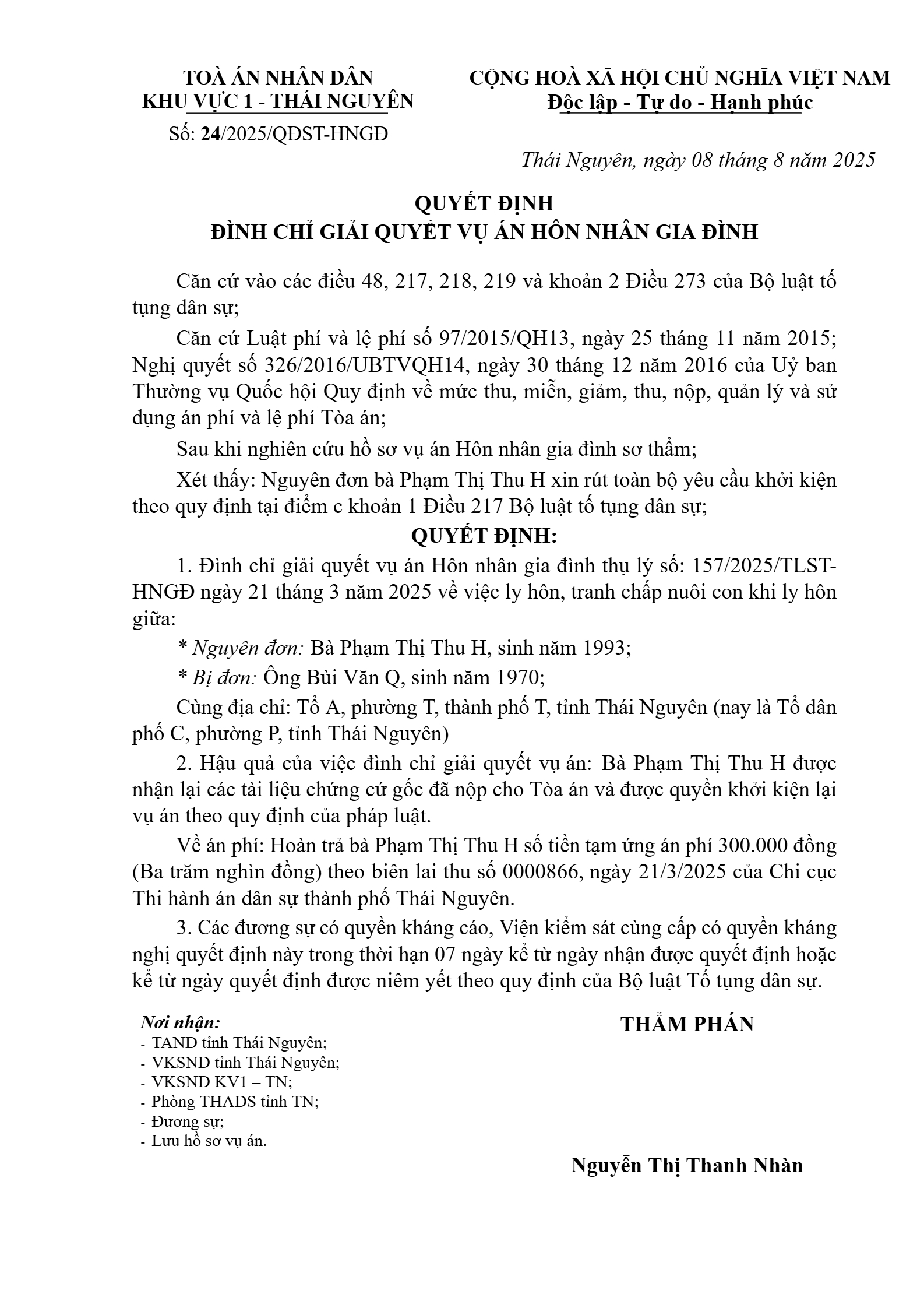 Quyết định số 40/2025/QĐST-HNGĐ ngày 24/09/2025 của Tòa án nhân dân khu vực 1 - Thái Nguyên, tỉnh Thái Nguyên về vụ án ly hôn về mâu thuẫn gia đình