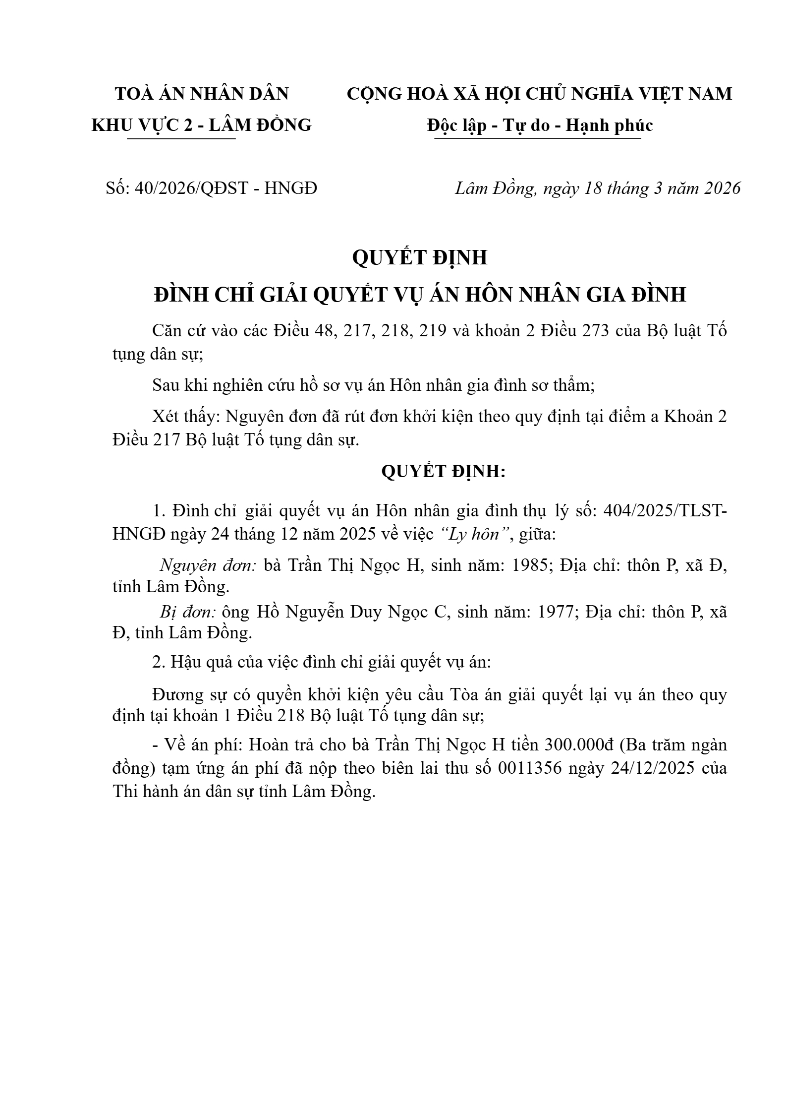 Quyết định số 40/2026/QĐST-HNGĐ ngày 18/03/2026 của Tòa án nhân dân khu vực 2 - Lâm Đồng, tỉnh Lâm Đồng về vụ án ly hôn về mâu thuẫn gia đình