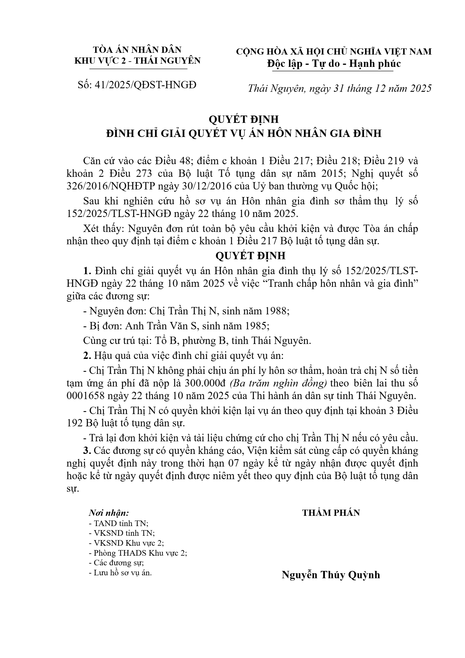 Quyết định số 41/2025/QĐST-HNGĐ ngày 31/12/2025 của TAND TP. Thái Nguyên, tỉnh Thái Nguyên về vụ án ly hôn về mâu thuẫn gia đình