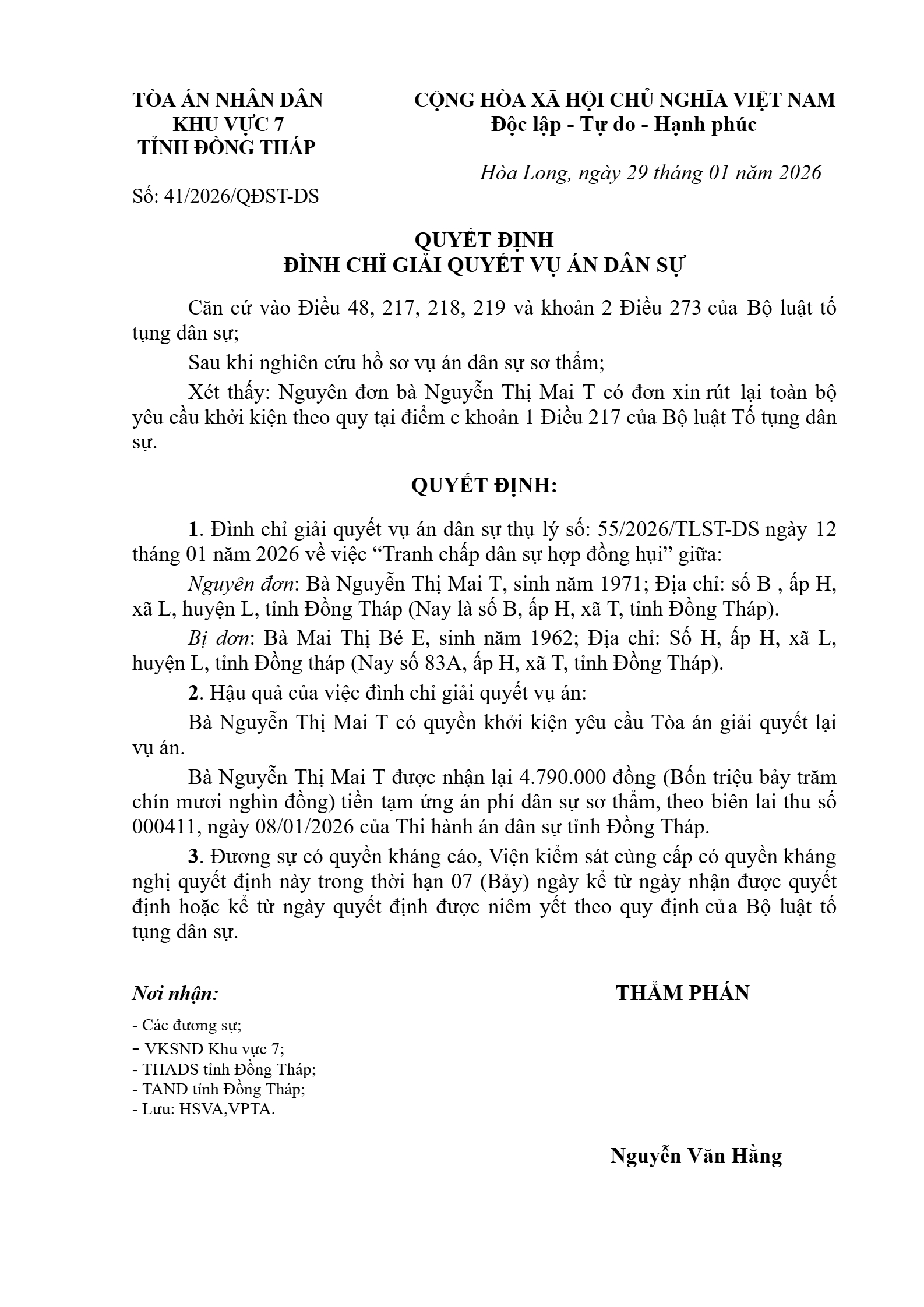 Quyết định số 41/2026/QĐST-DS ngày 29/01/2026 của Tòa án nhân dân khu vực 7 - Đồng Tháp, tỉnh Đồng Tháp về tranh chấp về hụi, họ, biêu, phường