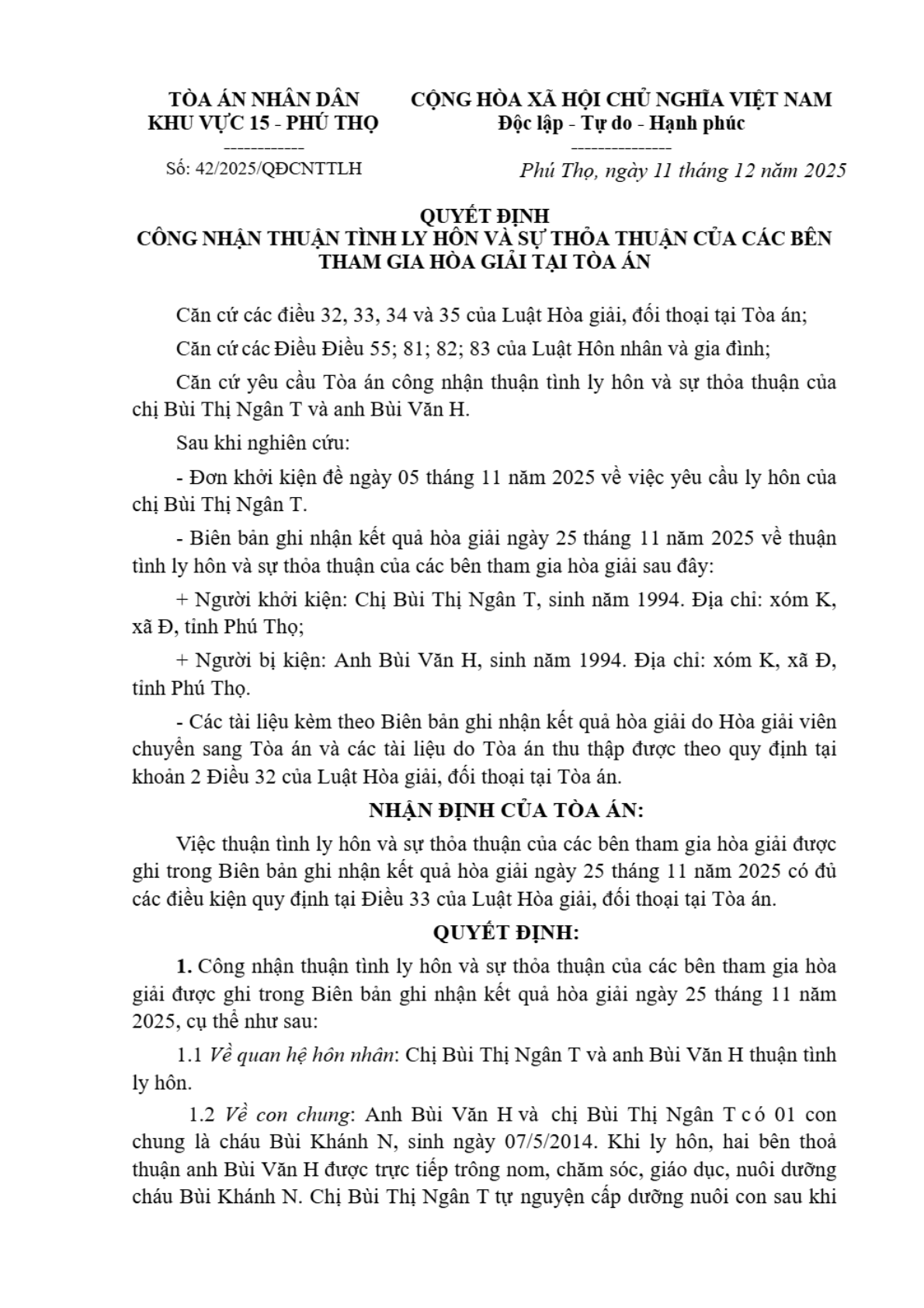 Quyết định số 42/2025/QĐCNTTLH ngày 28/02/2026 của Tòa án nhân dân khu vực 15 - Phú Thọ, tỉnh Phú Thọ về vụ án ly hôn về mâu thuẫn gia đình