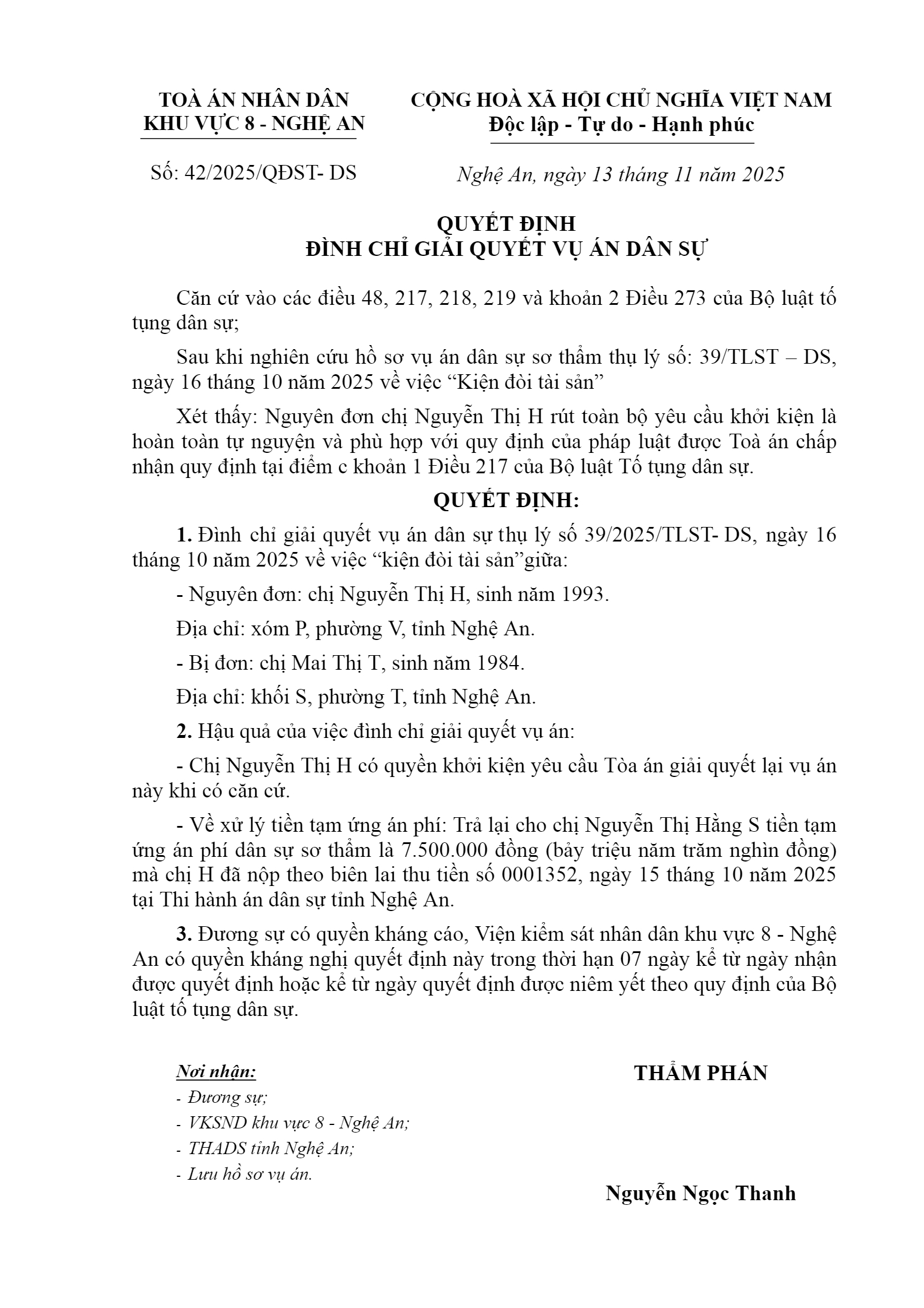 Quyết định số 42/2025/QĐST-DS ngày 13/11/2025 của Tòa án nhân dân khu vực 8 - Nghệ An, tỉnh Nghệ An về tranh chấp hợp đồng vay tài sản