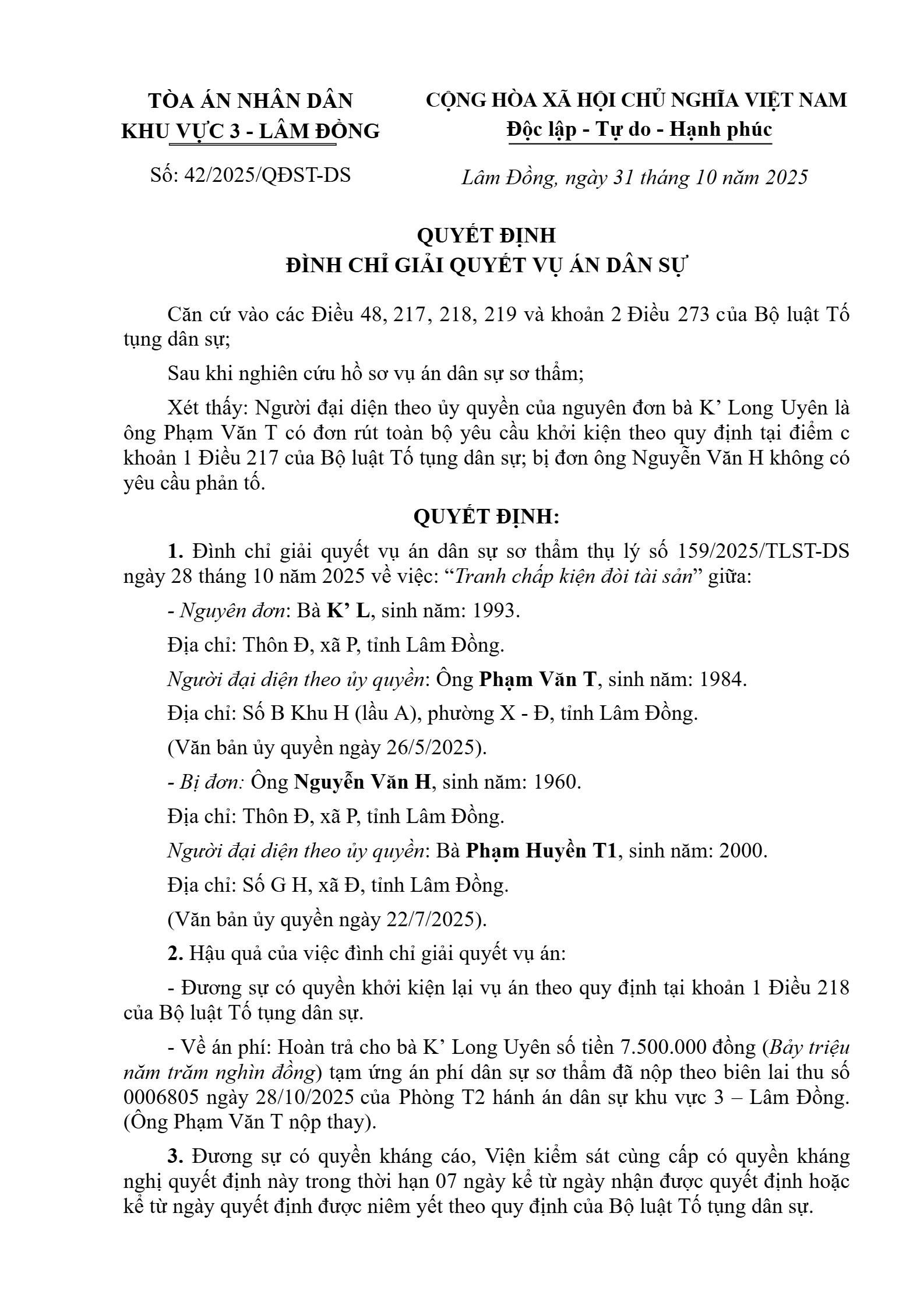 Quyết định số 42/2025/QĐST-DS ngày 31/10/2025 của Tòa án nhân dân khu vực 3 - Lâm Đồng, tỉnh Lâm Đồng về các tranh chấp dân sự trong trường hợp chưa có điều luật áp dụng