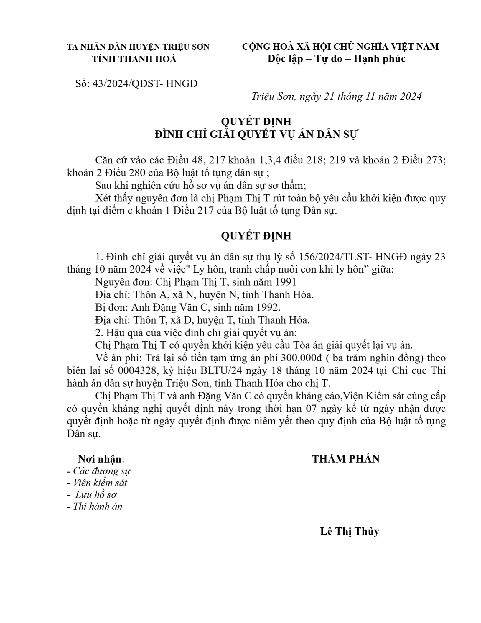 Quyết định số 43/2024/QDST-HNGD ngày 21/11/2025 của TAND huyện Triệu Sơn, tỉnh Thanh Hóa về vụ án ly hôn về mâu thuẫn gia đình