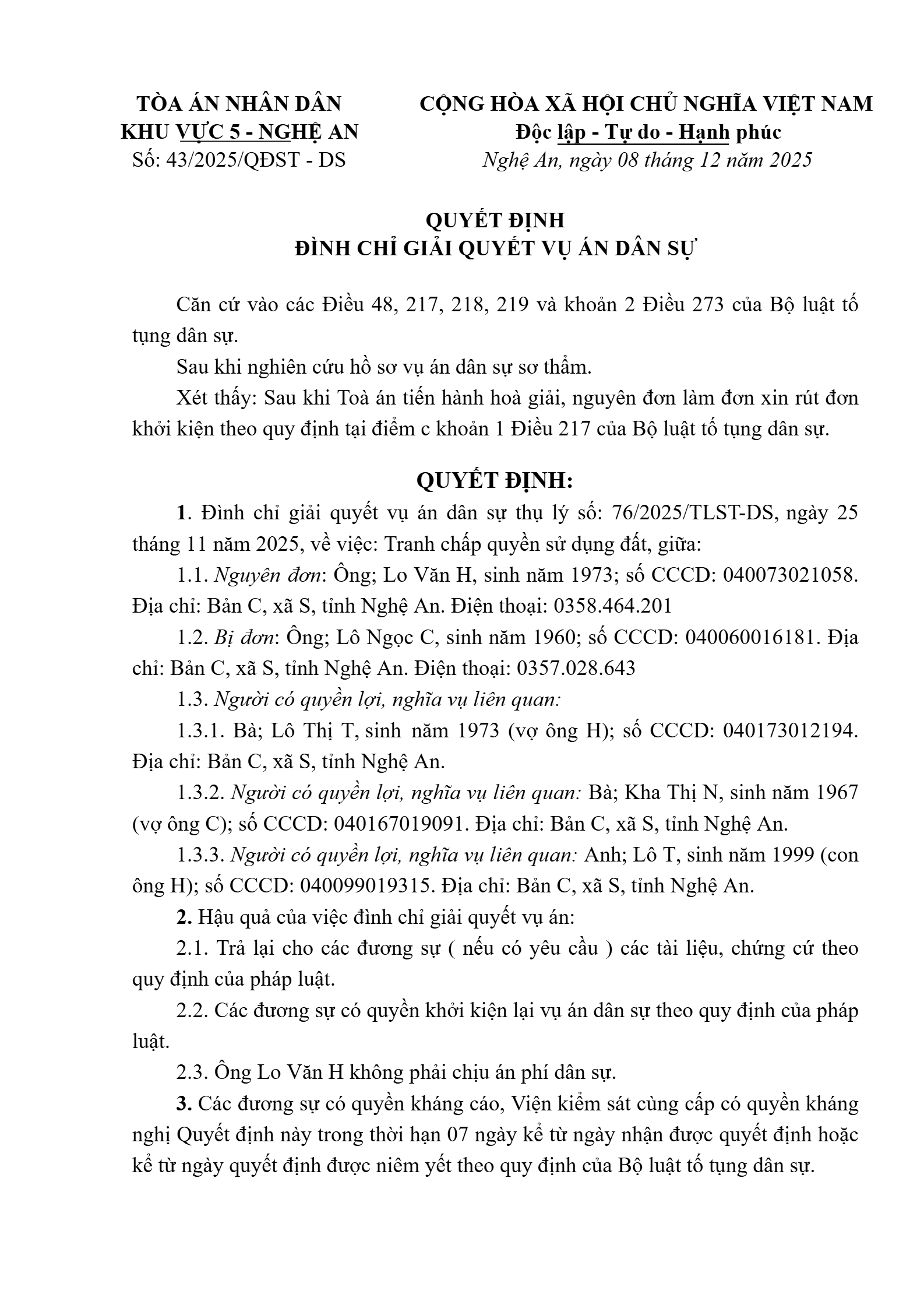 Quyết định số 43/2025/QĐST-DS ngày 08/12/2025 của Tòa án nhân dân khu vực 5 - Nghệ An, tỉnh Nghệ An về tranh chấp đất đai đối với đất nông nghiệp để trồng cây lâu năm, đất lâm nghiệp để trồng rừng, đất ở