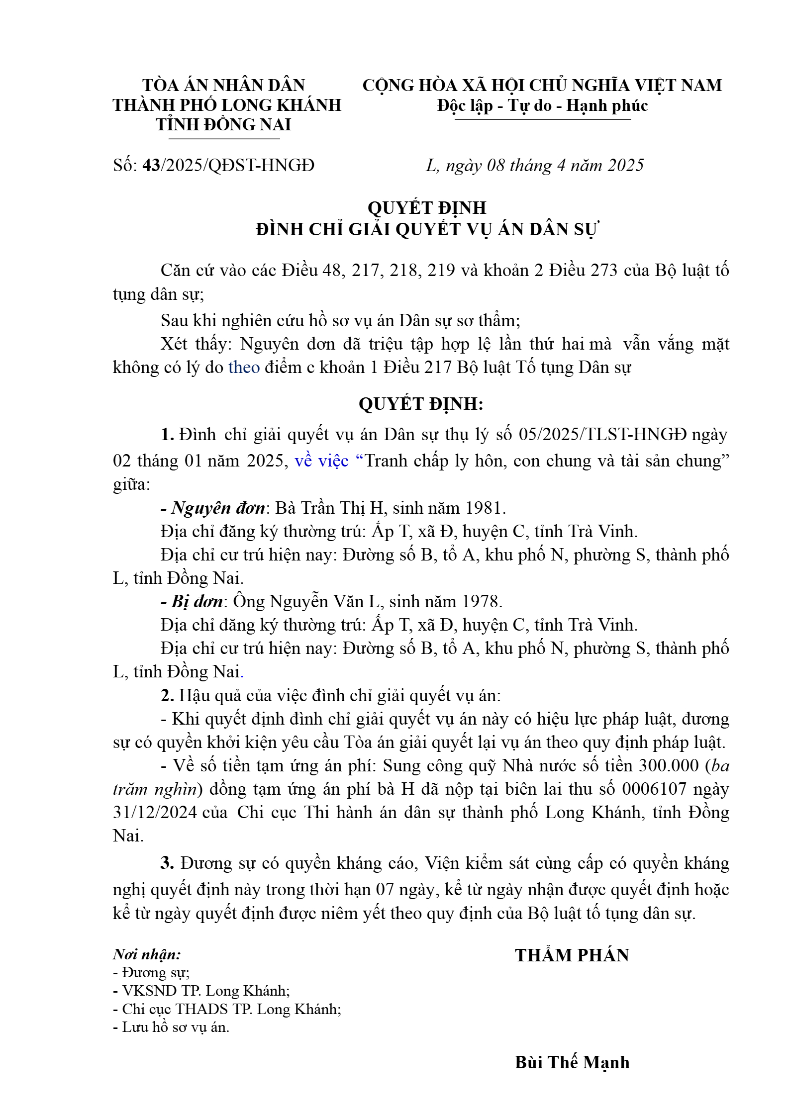 Quyết định số 43/2025/QĐST-HNGĐ ngày 08/04/2025 của TAND TX. Long Khánh, tỉnh Đồng Nai về vụ án ly hôn về mâu thuẫn gia đình