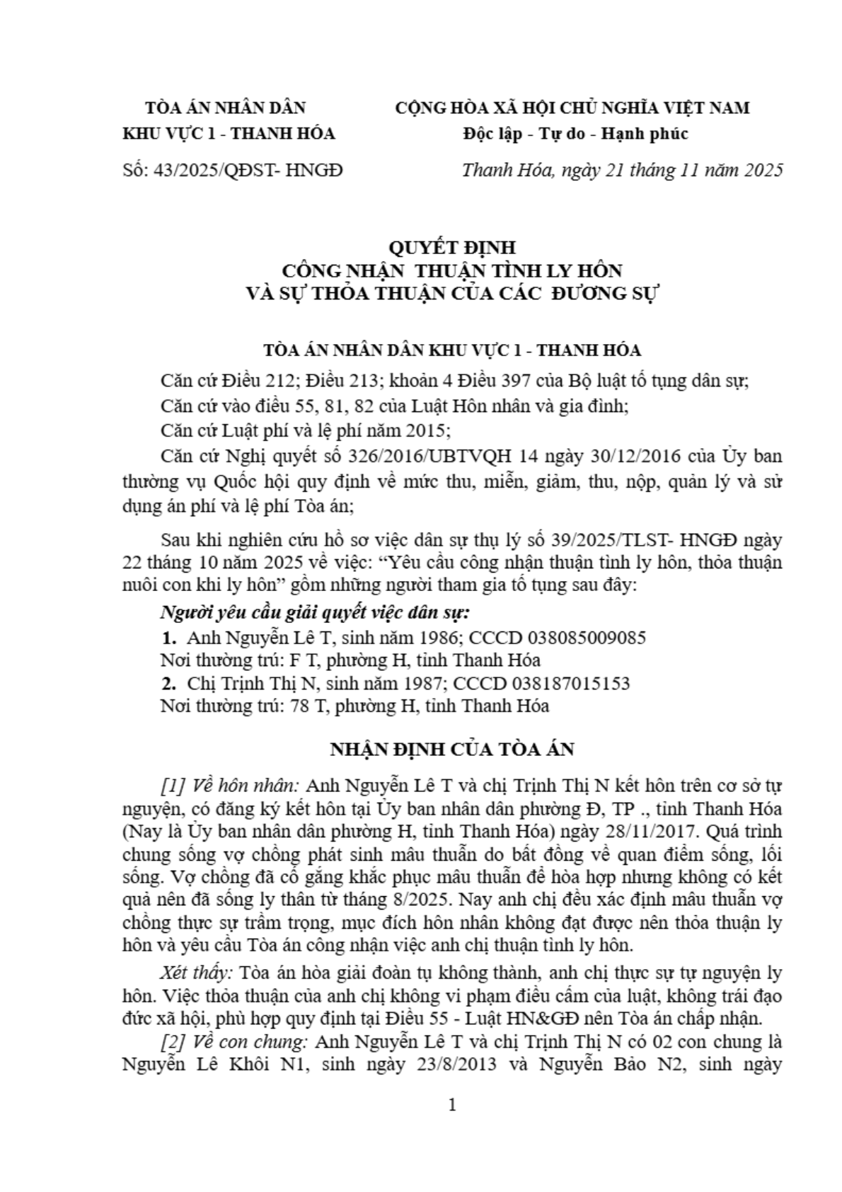 Quyết định số 43/2025/QĐST-HNGĐ ngày 21/11/2025 của Tòa án nhân dân khu vực 1 - Thanh Hóa, tỉnh Thanh Hóa về yêu cầu công nhận thuận tình ly hôn