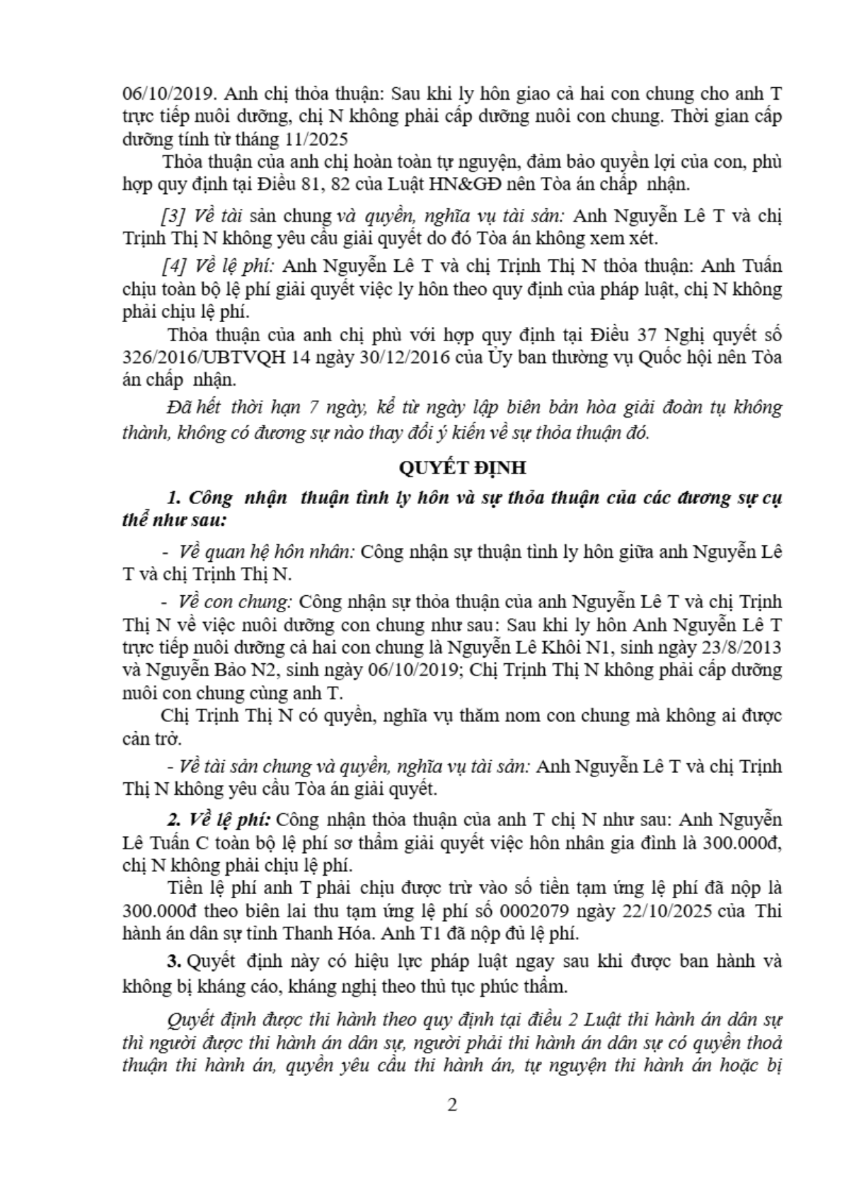| Thông tin về vụ/việc: | Nguyễn Lê T - Trịnh Thị N (Thuận tình ly hôn) |