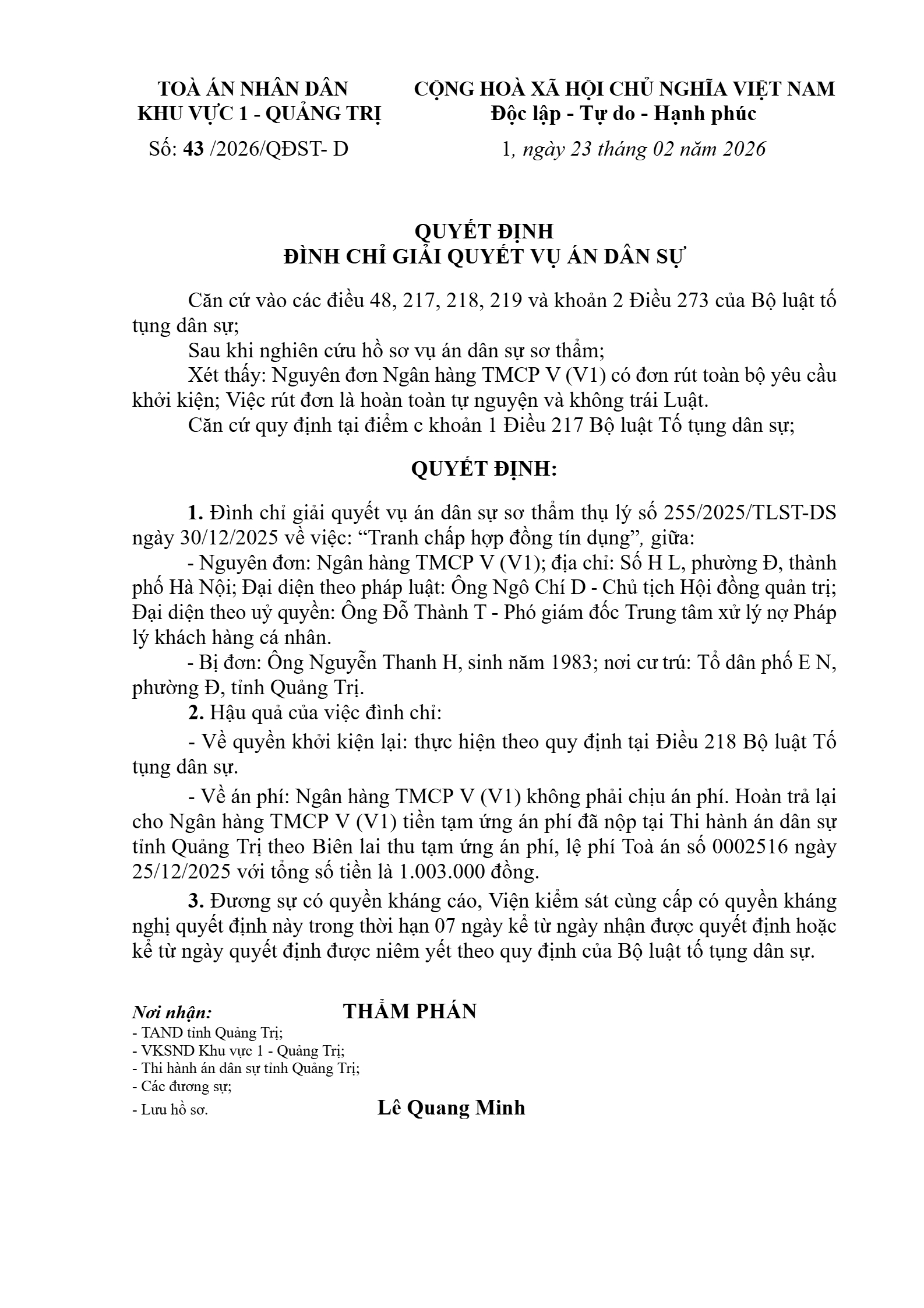 Quyết định số 43/2026/QĐST-DS ngày 23/02/2026 của Tòa án nhân dân khu vực 1 - Quảng Trị, tỉnh Quảng Trị về tranh chấp hợp đồng tín dụng