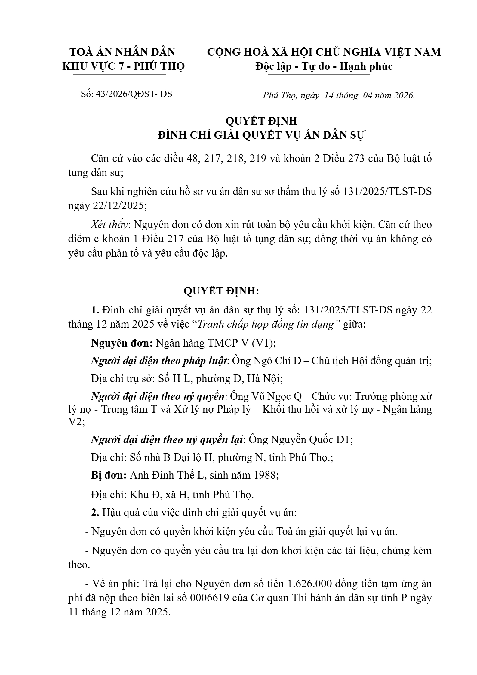 Quyết định số 43/2026/QĐST-DS ngày 14/04/2026 của Tòa án nhân dân khu vực 7 - Phú Thọ, tỉnh Phú Thọ về tranh chấp hợp đồng tín dụng
