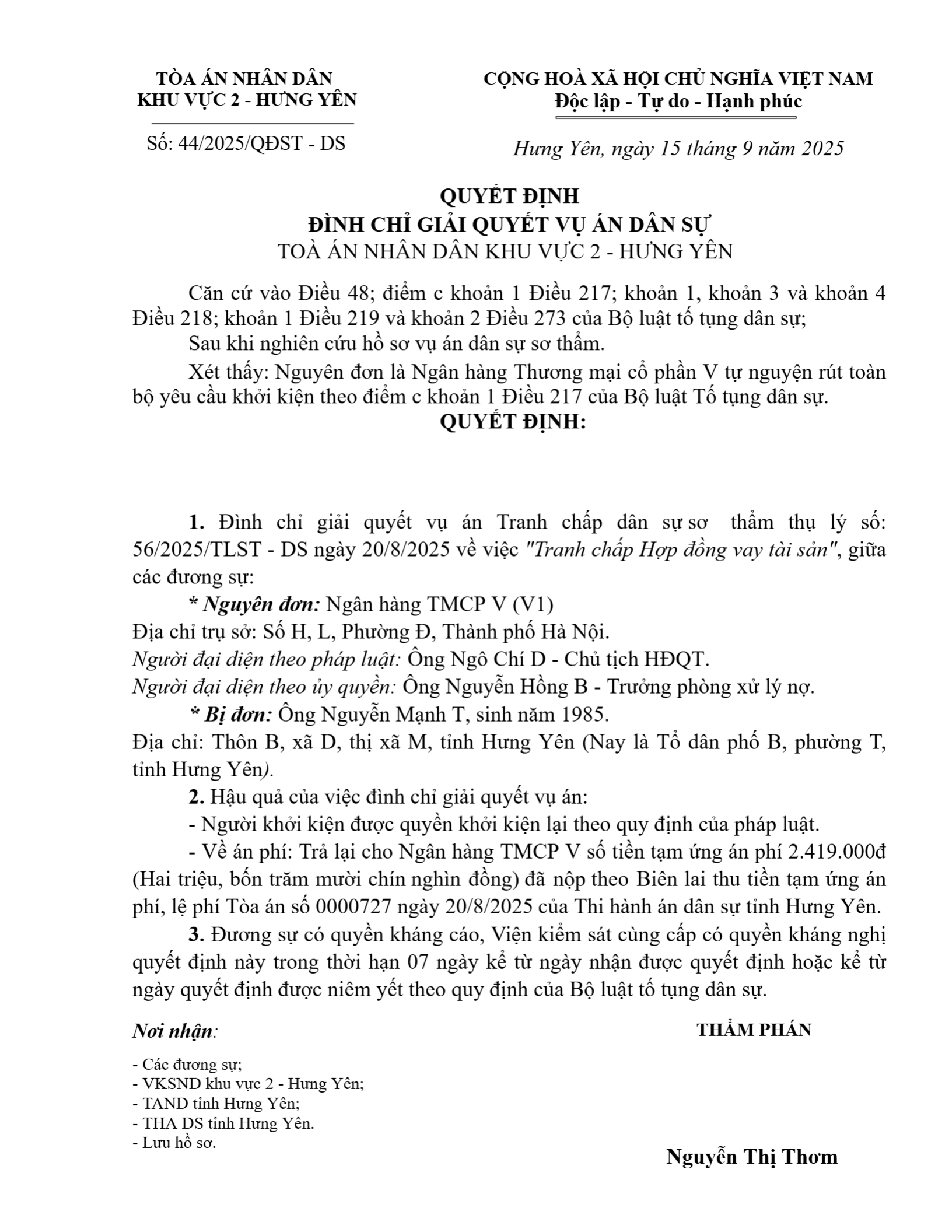 Quyết định số 44/2025/QĐST-DS ngày 15/09/2025 của Tòa án nhân dân khu vực 2 - Hưng Yên, tỉnh Hưng Yên về tranh chấp hợp đồng vay tài sản