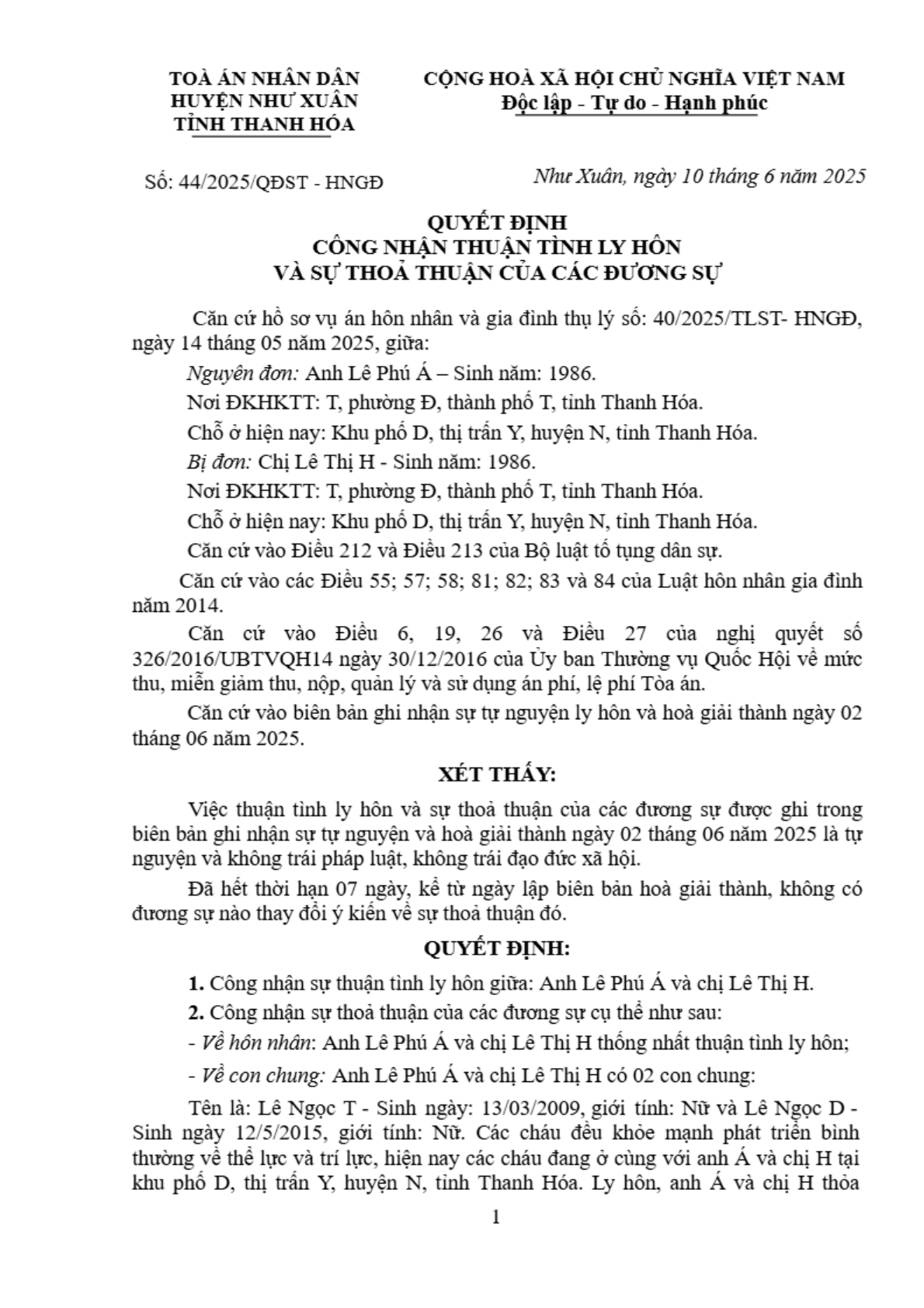 | Tên Quyết định: | Quyết định số 44/2025/QĐST-HNGĐ ngày 10/06/2025 của TAND huyện Như Xuân, tỉnh Thanh Hóa về vụ án ly hôn về mâu thuẫn gia đình |